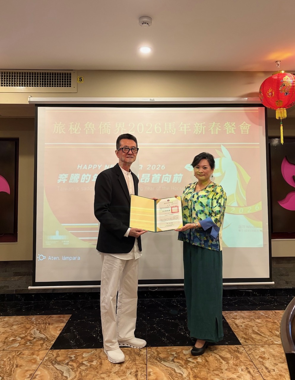 張代表致詞感謝旅秘僑胞長期支持政府,心向我們熱愛的台灣,成為政府最堅強的後盾,並引用外交部林部長新年賀詞祝願鄉親「馳騁寰宇、龍總馬吉」;另代表僑委會徐委員長頒贈僑務顧問續任聘書予劉忠信顧問,感謝其長期對僑界的貢獻與對政府的協助與支持。