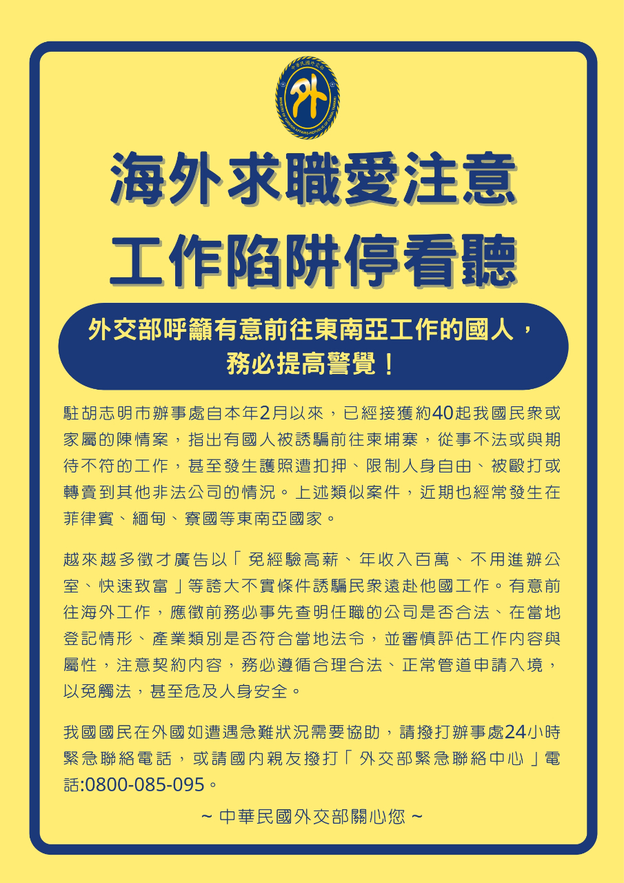 外交部再次呼籲國人注意海外求職陷阱,勿信話術保性命。