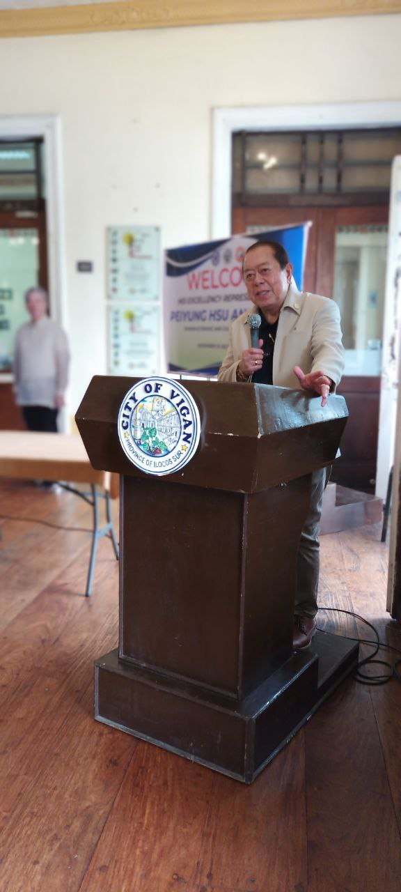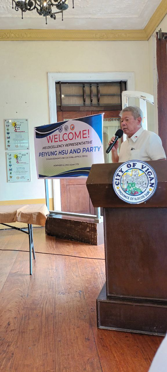 臺灣為菲律賓近鄰,臺灣人民對菲律賓遭逢之災情感同身受,徐代表除向災區家庭表達我政府及人民的慰問及關懷,亦表示受損古蹟之修復涉及公共安全維護與文化保存,攸關美岸市自疫後經濟復甦,希望受損古蹟早日完成修復工程,重現光華。Singson Jr.市長代表該市政府向中華民國政府的慷慨捐贈表達最誠摯的感謝。