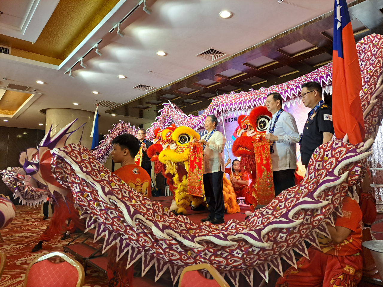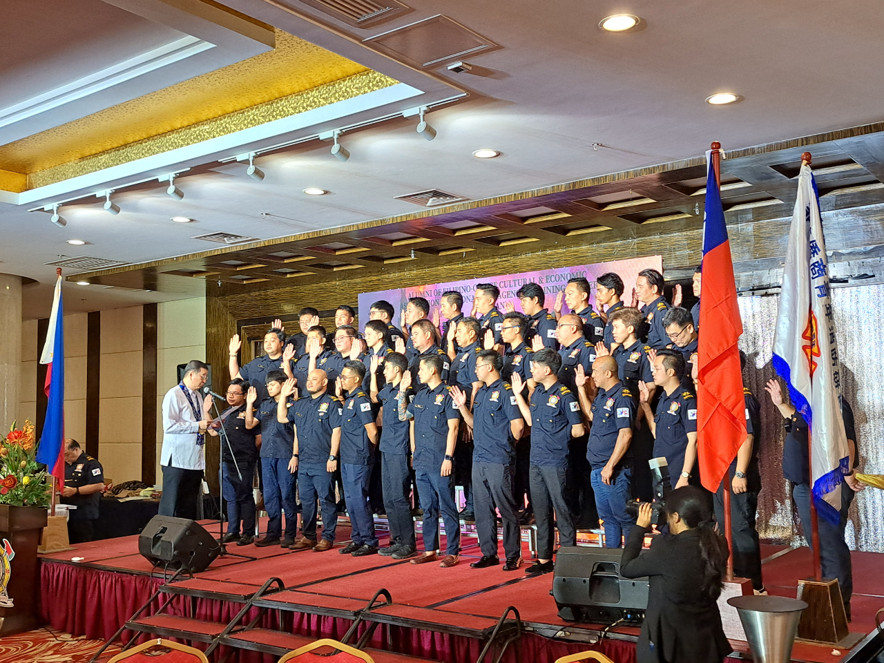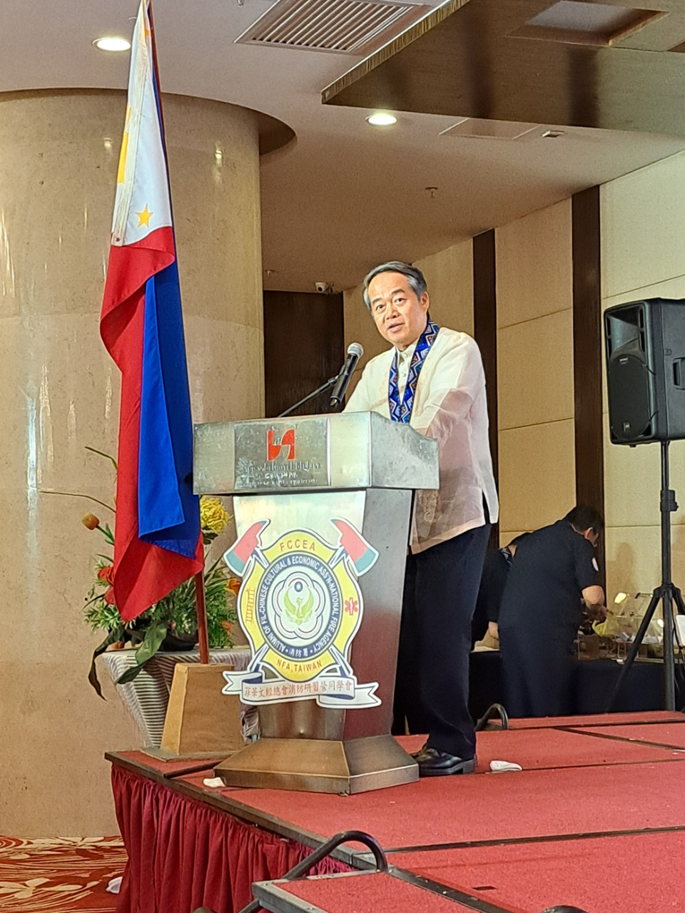 菲華文經總會消防研習營同學會(Alumni of Fil-Chinese Cultural & Economic Association-National Fire Agency of Taiwan,FCCEA-NFA)於8月25日中午假位於馬尼拉Sta. Cruz的新都城酒店(Swiss-Belhotel)舉行慶祝成立10週年暨第12期學員入會授證儀式。同學會周常務理事圩烈擔任大會主席、菲華文經總會常務委員陳柏材監誓,本處周民淦大使及菲律濱消防署副署長關張將軍(FCSUPT Wilberto Rico Neil Ang Kwan Tiu)受邀蒞臨,全場有來自大馬尼拉地區、呂宋、未獅耶及岷答那峨的同學會成員出席,在熱鬧的鑼鼓聲中先有舞龍醒獅進場炒熱氣氛而揭開活動序幕。