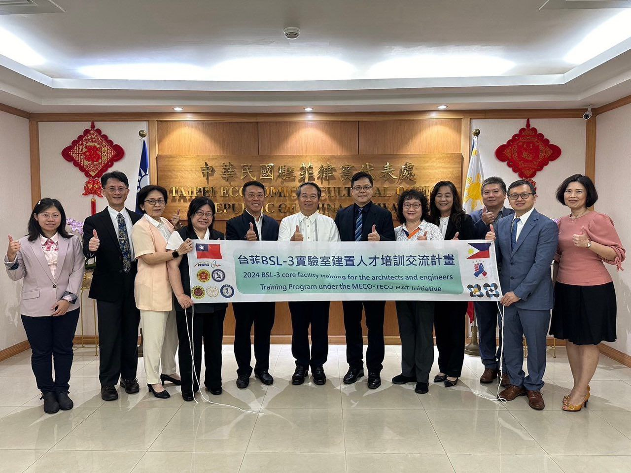 駐菲律賓代表處周民淦大使2024年9月3日上午會晤由國防醫學院陳正忠博士帶領之國科會防疫科學研究中心交流團隊,僑務委員黃雅惠、台商總會林登峰總會長陪同,就台菲在防疫交流計畫執行狀況與未來發展熱烈交換意見。 周大使肯定國科會防疫科學研究中心團隊對推動台菲交流計畫之付出,並期勉BSL-3實驗室人才培訓計畫順利進行,以提升菲國在生物防疫方面之能力,同時深化雙邊科技合作關係。