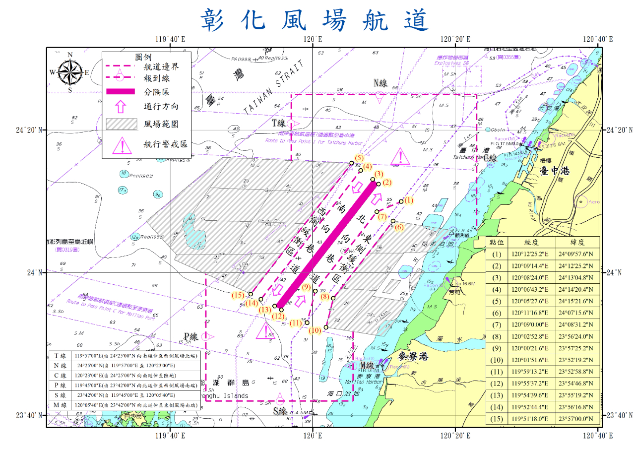 為配合我國彰化離岸風場開發,交通部於本(110)年4月26日核定公告發布「彰化風場航道」及其航行指南,該航道資訊業經內政部建置於我國官方電子航行圖,並已促請本國航運業者使用該最新圖資,該部航港局遵循國際海事組織(International Maritime Organization;IMO)海事安全委員會(The Maritime Safety Committee;MSC)規定,風場航道訂於公告後6個月(即110年10月26日)正式實施。