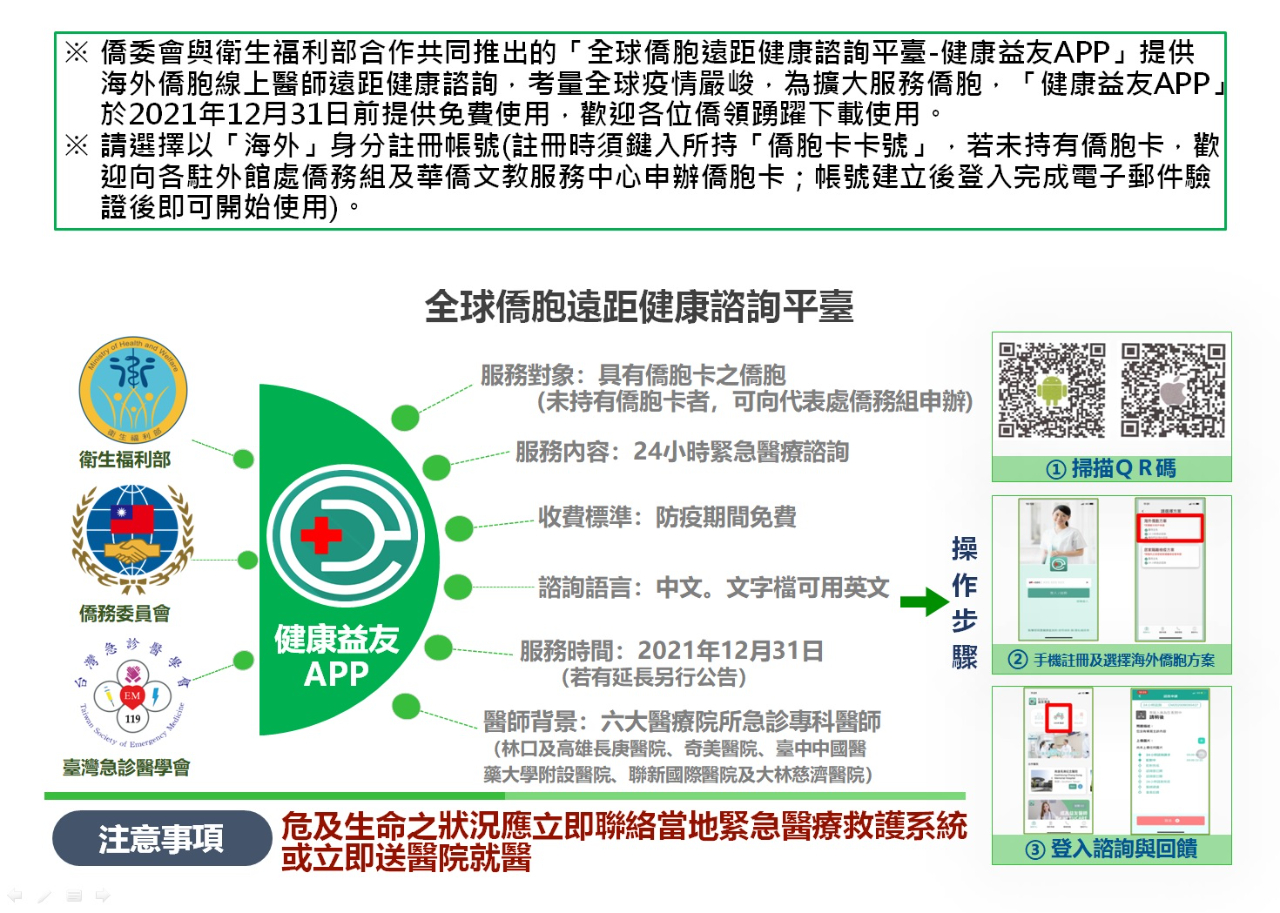 一、僑委會與衛生福利部合作共同推出「全球僑胞遠距健康諮詢方案—健康益友APP」,提供海外僑胞線上臺灣醫師遠距健康諮詢,為持續服務僑胞,該方案延長至本年12月31日前提供免費使用。