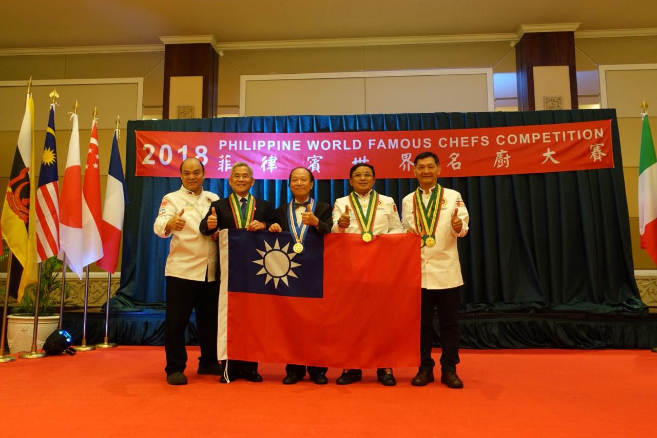 TECO Representative Michael Peiyung Hsu poses with Mr. Jimmy Shang (Left 3), Chairman of the Chinese International Gastronomers Association and the participants of the 2018 Philippine World Famous Chefs Competition during the Awarding Dinner held at the Manila Hotel on August 22, 2018.(2018-09-07)