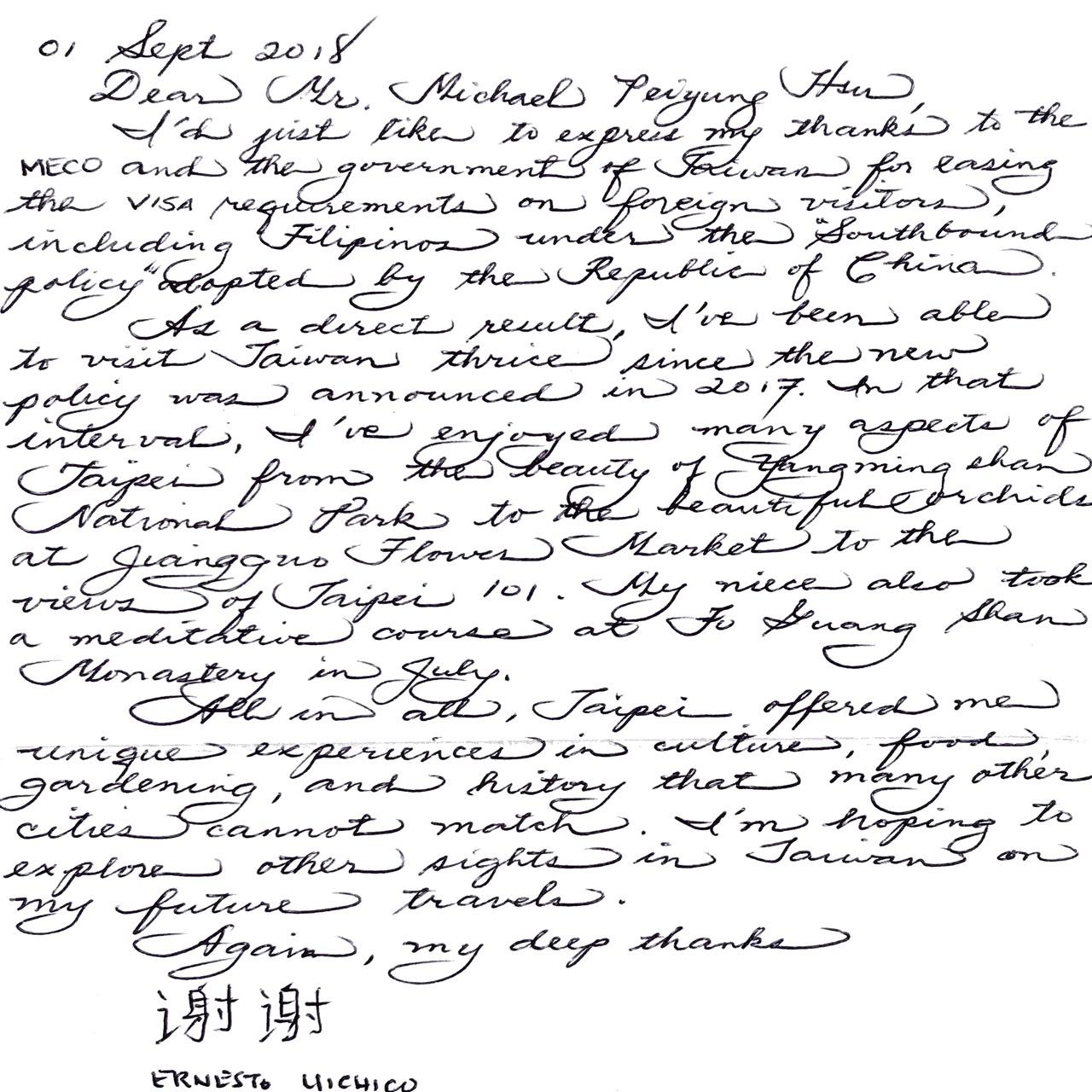 A letter of appreciation addressed to TECO Representative Michael Peiyung Hsu and the ROC (Taiwan) Government for granting Visa-free treatment for Filipino travellers to Taiwan.