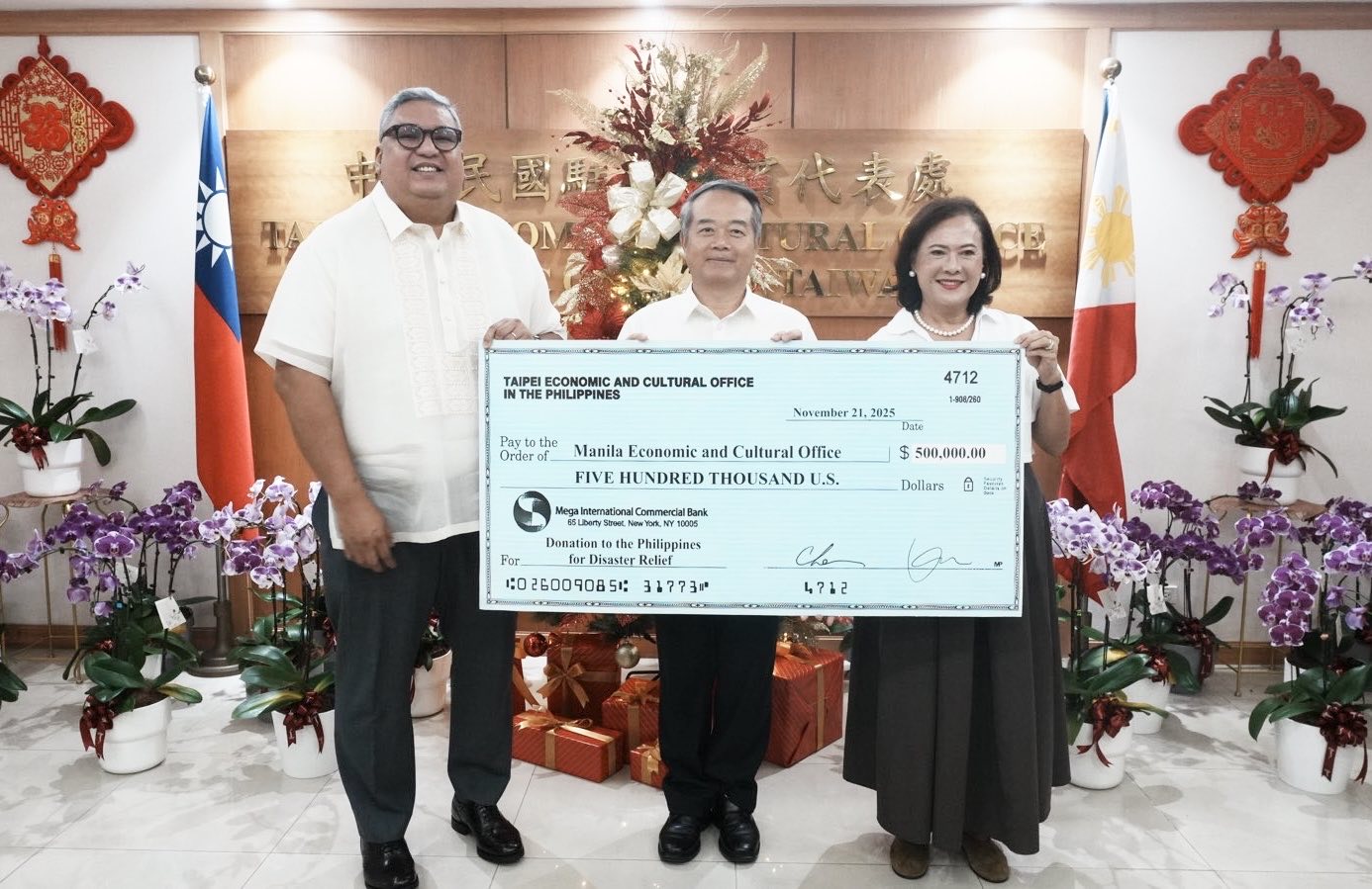 On November 21, 2025, Ambassador Wallace Chow of the Taipei Economic and Cultural Office in the Philippines (TECO), on behalf of the Government of Republic of China (Taiwan), ceremonially handed over a US$500,000 cash donation for humanitarian assistance to Chairperson Corazon Padiernos of the Manila Economic and Cultural Office (MECO). This latest contribution further strengthens Taiwan’s support for Filipino communities affected by the recent series of devastating natural disasters, including Typhoon Kalmaegi (Tino) and Super Typhoon Fung-wong (Uwan).