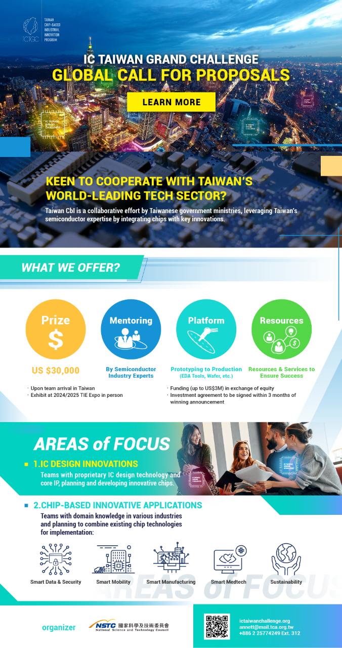 To boost Taiwan’s position as a leading IC startup cluster, the National Science and Technology Council (NSTC) organizes the IC Taiwan Grand Challenge. It offers local incentives such as chip tape-out, masks, and IP services, collaborates with leading semiconductor companies for investment, and establishes public-private venture capital funds. These efforts aim to attract global talent and investment, with the goal of making Taiwan a hub for innovation chip technology.