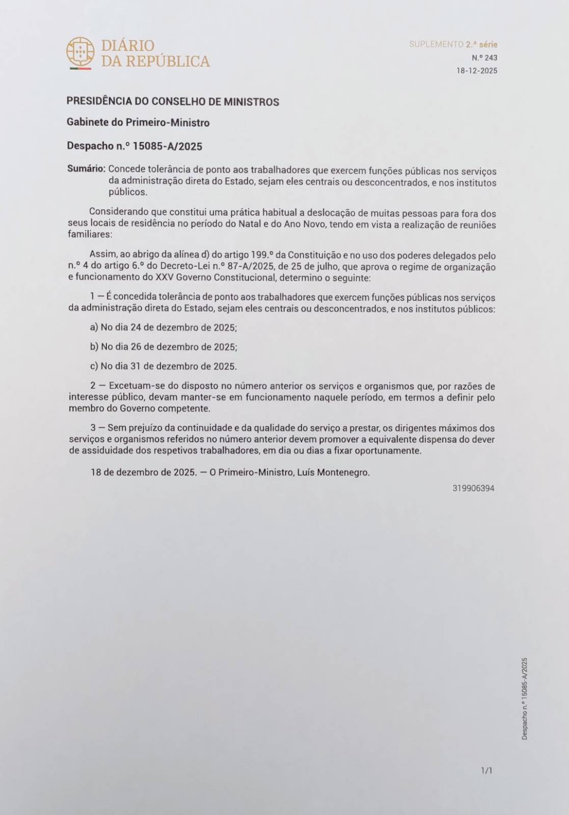 配合葡萄牙總理府發布公報,核給國家中央行政部門及所屬公共機構人員公假3日,停班日期為2025年12月24日、12月26日及12月31日。