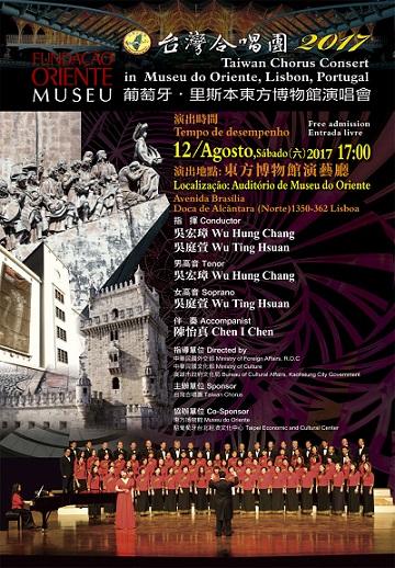 來自南台灣的「台灣合唱團」經駐葡代表處的協助安排,將代表台灣於2017年8月12日(星期六17:00pm),在里斯本東方博物館演藝廳盛大演出多位台灣國寶級作曲家蕭泰然、黃友棣、林福裕的代表性作品。曲目包括:宗教詩歌、藝術歌曲以及台灣歌謠等十餘首國、台、客語作品,皆是優美動聽的經典歌曲,熱情演繹精緻的合唱音樂藝術及台灣人文風情。此場演唱會由留義聲樂家暨合唱指揮家—吳宏璋、吳庭萱擔任指揮及男高音、女高音獨唱,陳怡真擔任伴奏。。