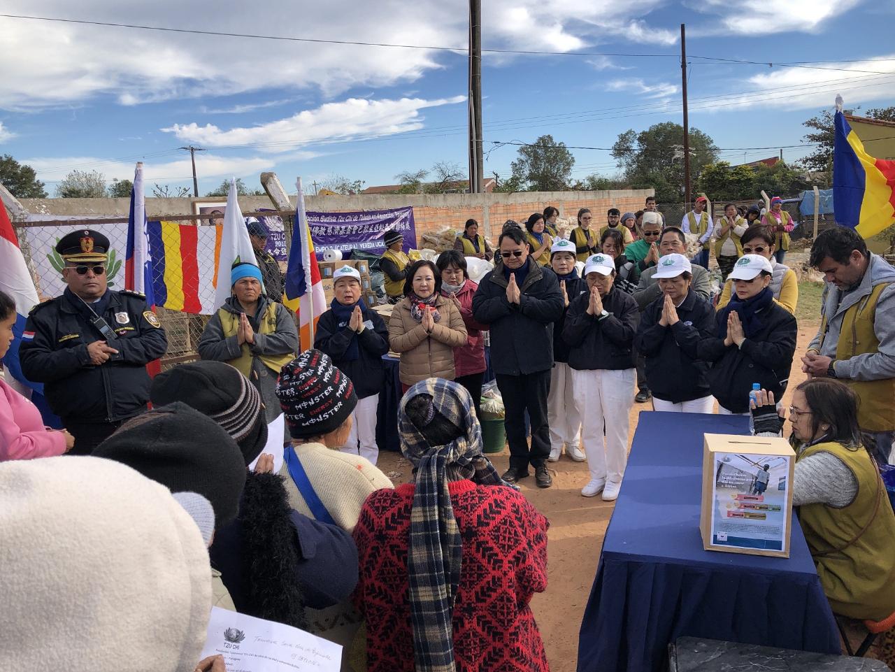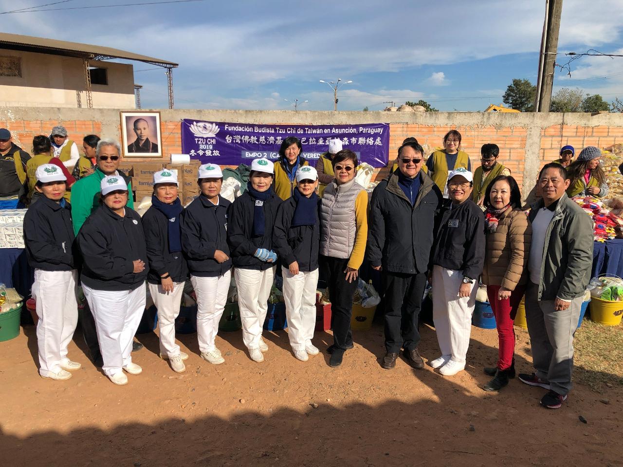 慈濟基金會亞松森聯絡處為了協助巴拉圭首都地區受水患影響的災民度過寒冬, 7月7日上午在巴京亞松森近郊Lambaré市河濱災民臨時棲身居所舉行2019冬令發放,駐巴拉圭大使館周麟大使夫婦、亞松森中華會館理事長古美桂、僑務諮詢委員李復淵等也出席響應慈善義舉,協助發放物資並撫慰災民。