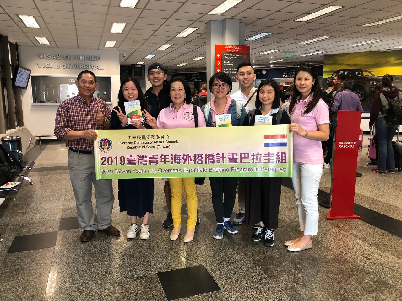 照片二:學員於20日抵達巴拉圭國際機場,亞松森中華會館古美桂理事長夫婦(前排左1、3)與副理事長李怡樺(右1)熱心前往接機照料。