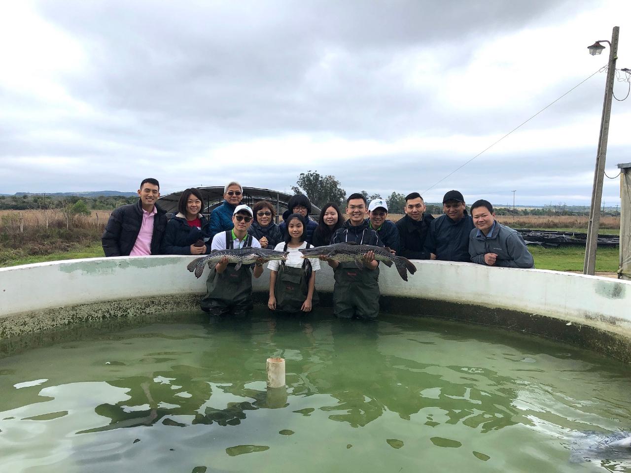 照片五:僑務諮詢委員李復淵(後排左3)陪同學員前往國合會鴨嘴魚苗繁養殖計畫參訪。