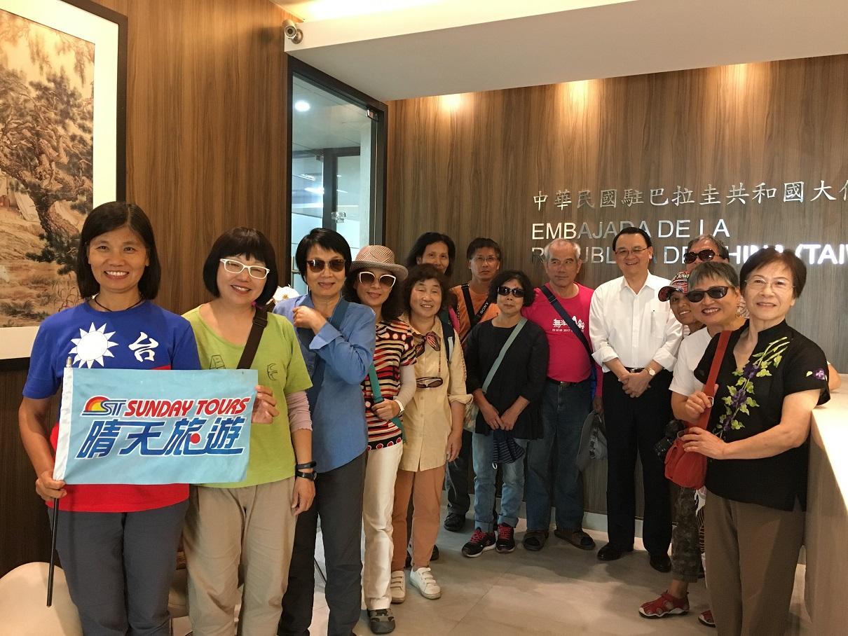 國內晴天旅行社籌組的赤道南美八國完整深度旅行團一行13人於本(22)日下午抵達我駐巴拉圭大使館參訪,並由周麟大使親自接待。