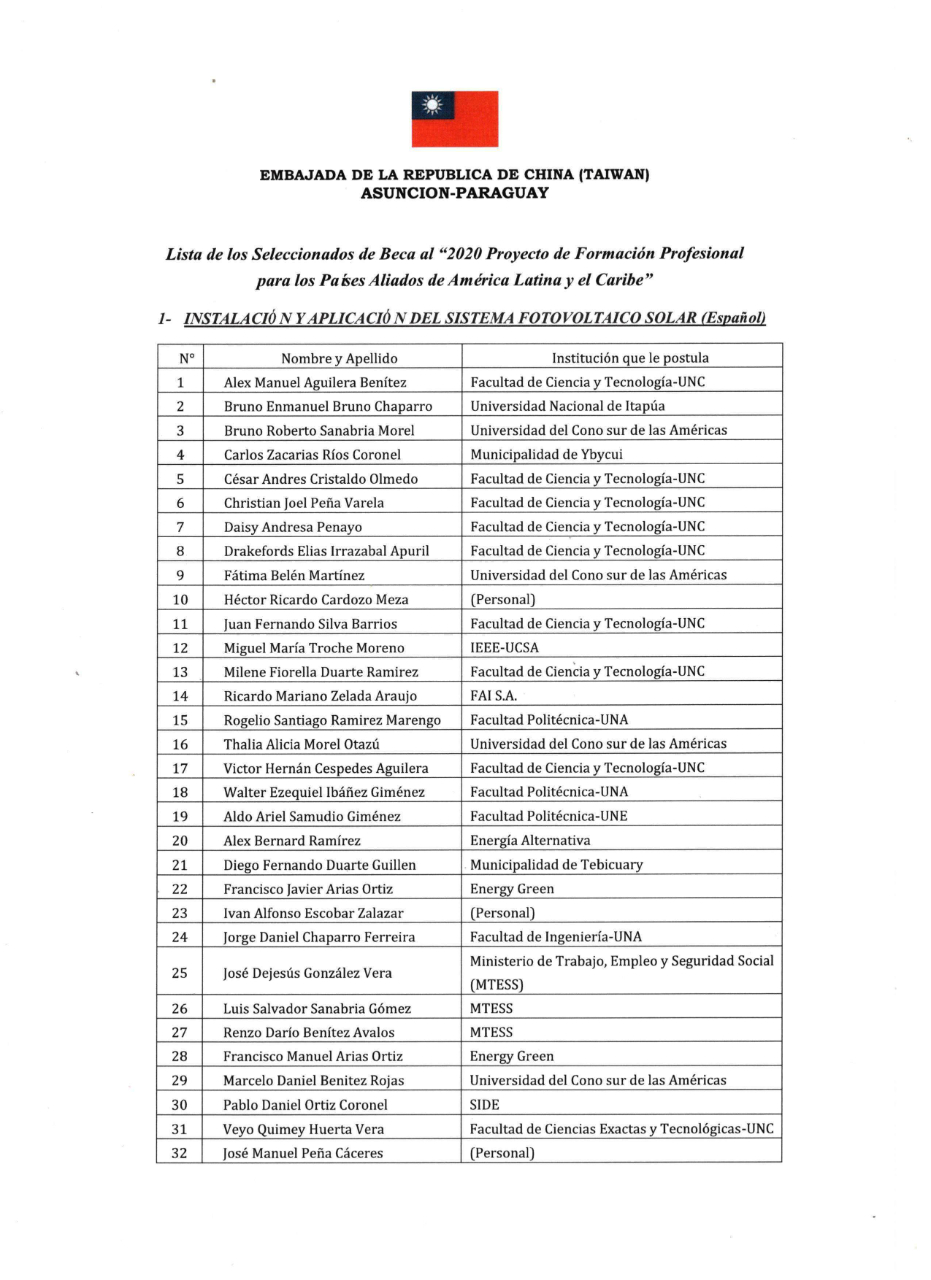“2020年拉丁美洲與加勒比海友邦技職訓練計畫” 巴拉圭初選名單揭曉 - 駐巴拉圭共和國大使館 Embajada de la República de China (Taiwán) en la República del Paraguay ::: 跳到主要內容區塊