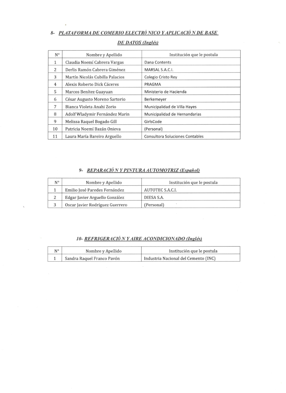 為協助巴拉圭等拉丁美洲及加勒比海友邦青年培養技術技能,並分享我國職業訓練經驗,國合會提供10項訓練課程包括:綠能光電系統建置與應用技術(西班牙語),觀光旅館民宿經營(英語和西班牙語),食品加工與包裝設計(英語和西班牙語),中式餐飲及加盟創業(英語和西班牙語),電子商務平台與資料庫應用(英語),汽車修護與烤漆美容(西班牙語),冷凍空調節能(英語)。