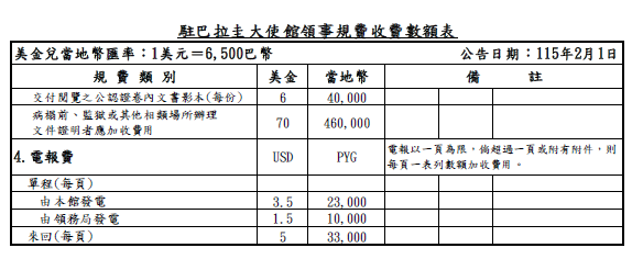 駐巴拉圭共和國大使館於2026年2月1日起因應美元兌巴幣匯率變動,相應調整領事規費之巴幣收費數額,詳請參考下表: