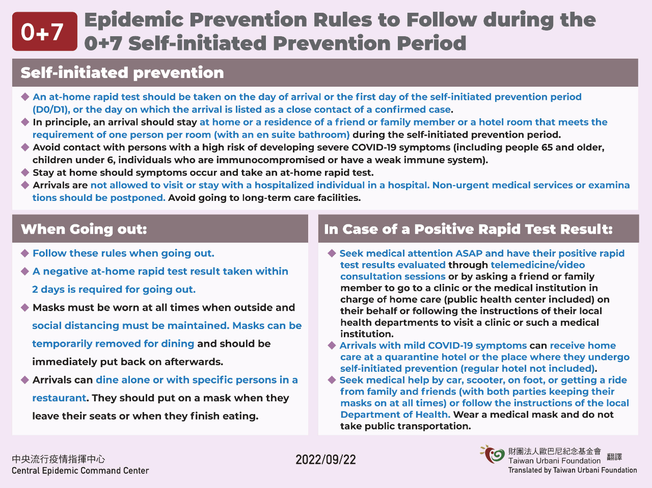 La CECC reiteró que los viajeros que llegan deben adherirse a las medidas de prevención de epidemias a medida que se levantan las restricciones fronterizas. Los viajeros que llegan deben seguir las reglas de prevención personal que indican qué hacer si dan positivo con un test rápido. Los viajeros que lleguen deben buscar atención médica lo antes posible y evaluar sus resultados positivos del test rápido a través de telemedicina/videoconsultas o pidiéndole a un amigo o familiar que vaya a una clínica o a la institución médica a cargo de la atención domiciliaria (centro de salud público incluido), en su nombre o siguiendo las instrucciones de sus Departamentos de salud locales para visitar una clínica o una institución médica de este tipo.