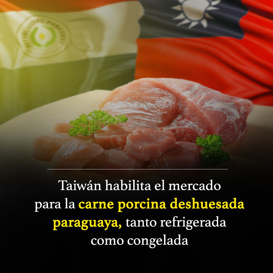El gobierno de la República de China (Taiwán) anuncia que a partir del 28 de noviembre del 2022 la carne porcina deshuesada paraguaya, tanto refrigerada como congelada, está habilitada para su exportación al mercado taiwanés. Esta apertura representa un beneficio para la industria cárnica paraguaya que podrá comercializar otro de sus productos premium en Taiwán sin cuota establecida para su importación, es también un logro sumamente importante para las relaciones bilaterales entre ambos países.