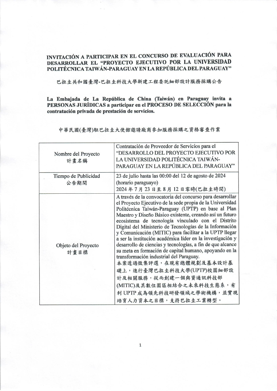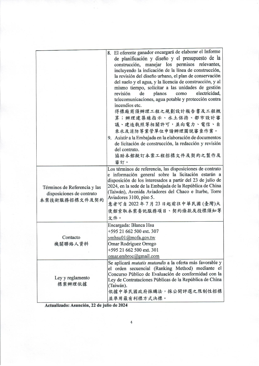 | Términos de Referencia y las disposiciones de contrato本案技術服務招標文件及契約 | Los términos de referencia, las disposiciones de contrato e información general sobre la licitación estarán a disposición de los interesados a partir del 23 de julio de 2024, en la sede de la Embajada de la República de China (Taiwán), Avenida Aviadores del Chaco e Iturbe, Torre Aviadores 3100, piso 5.意者可自2022年7月23日起前往中華民國 (臺灣)大使館索取本案委託服務項目、契約條款及投標須知等文件。 |