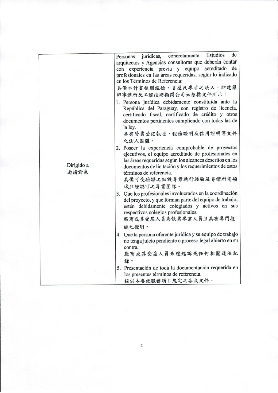 | Dirigido a邀請對象 | Personas jurídicas, concretamente Estudios de arquitectos y Agencias consultoras que deberán contar con experiencia previa y equipo acreditado de profesionales en las áreas requeridas, según lo indicado en los Términos de Referencia:具備本計畫相關經驗、資歷及專才之法人,即建築師事務所及工程技術顧問公司如招標文件所示:1. Persona jurídica debidamente constituida ante la República del Paraguay, con registro de licencia, certificado fiscal, certificado de crédito y otros documentos pertinentes cumpliendo con todas las de la ley.
