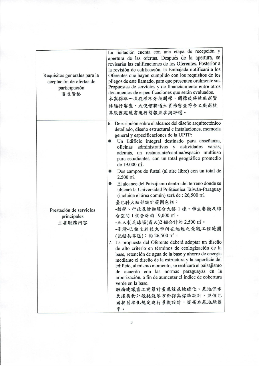 | Requisitos generales para la aceptación de ofertas de participación審查資格 | La licitación cuenta con una etapa de recepción y apertura de las ofertas. Después de la apertura, se revisarán las calificaciones de los Oferentes. Posterior a la revisión de calificación, la Embajada notificará a los Oferentes que hayan cumplido con los requisitos de los pliegos de este llamado, para que presenten oralmente sus Propuestas de servicios y de financiamiento entre otros documentos de especificaciones que serán evaluados.本案採取一次投標不分段開標,開標後將就廠商資格進行審查,大使館將通知資格審查符合之廠商就其服務建議書進行簡報並參與評選。 |