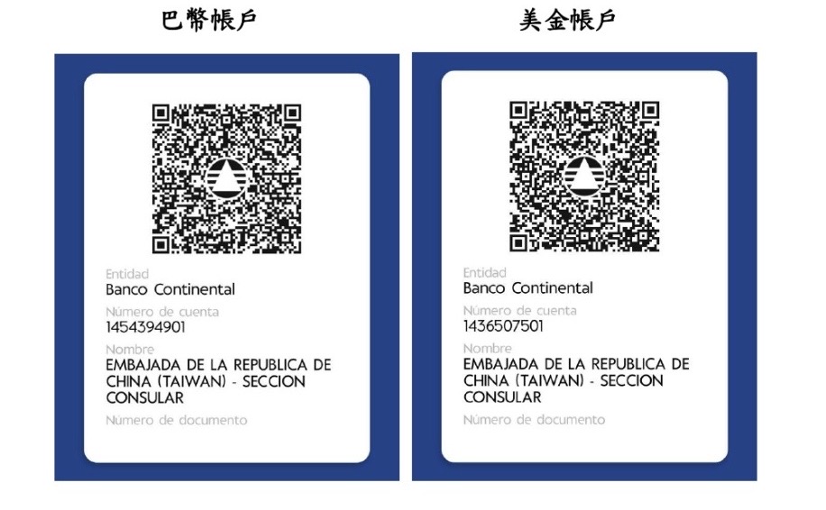 La Embajada de la República de China (Taiwán) en Paraguay informa que, a partir del 14 de octubre de 2024 (lunes), estará disponible la opción para que el público elija pagar las tasas consulares en efectivo o mediante transferencia bancaria. Si decide realizar el pago por transferencia bancaria, le solicitamos que siga la siguiente información de la cuenta (izq. cuenta guaranies, der. cuenta dólares):