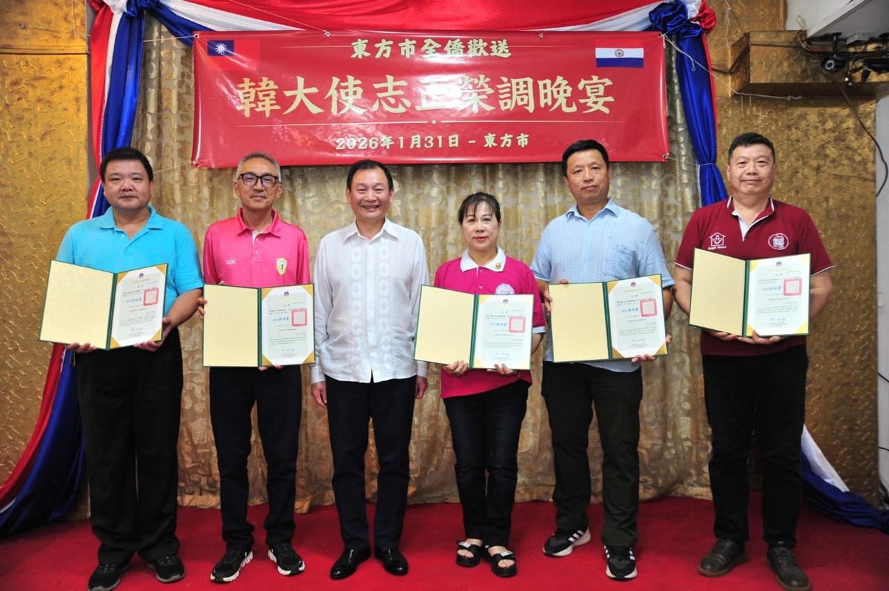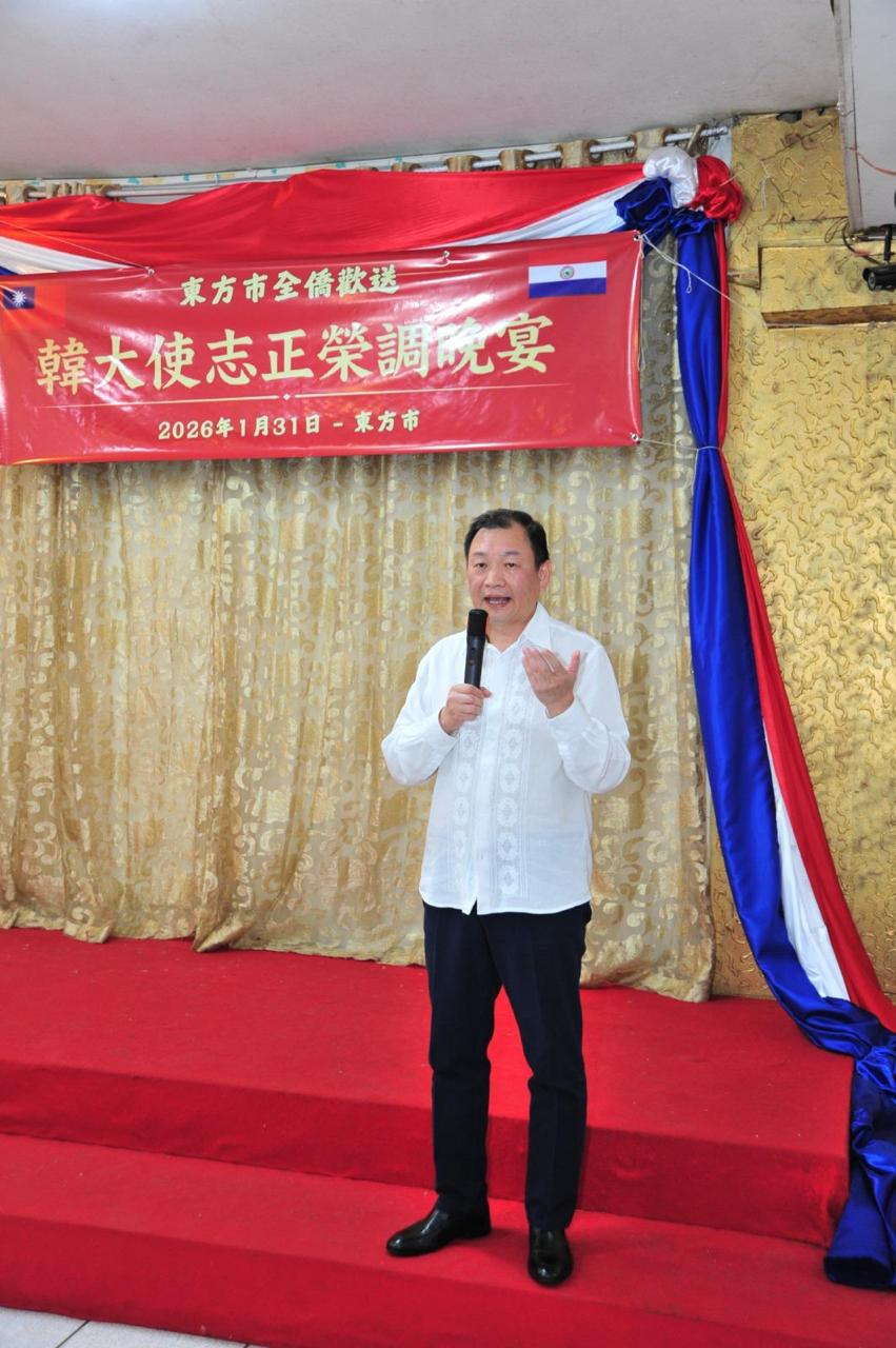 1月31日東方市全僑舉辦歡送韓志正大使榮調晚宴,陳總領事偕總領事館同仁出席,僑務榮譽職人員、各社團負責人及僑胞鄉親齊聚一堂,一同感謝韓大使5年8個月來對鞏固台巴邦交的卓越貢獻,同時恭喜韓大使榮升外交部拉丁美洲及加勒比海司司長。