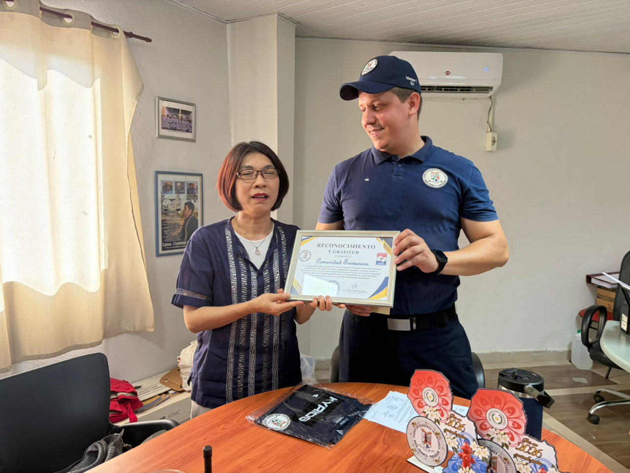 活動現場由 José Velázquez 大隊長、Roberto Zarate 副隊長等人接待,包括杜德光僑務諮詢委員、廖哲毅僑務顧問、簡仲庭僑務促進委員等僑領,共同見證這項富有意義的善舉。透過此次捐贈,不僅深化僑界與當地社區之間的情誼,也展現臺灣人在海外積極參與公益、與社會共好的精神。