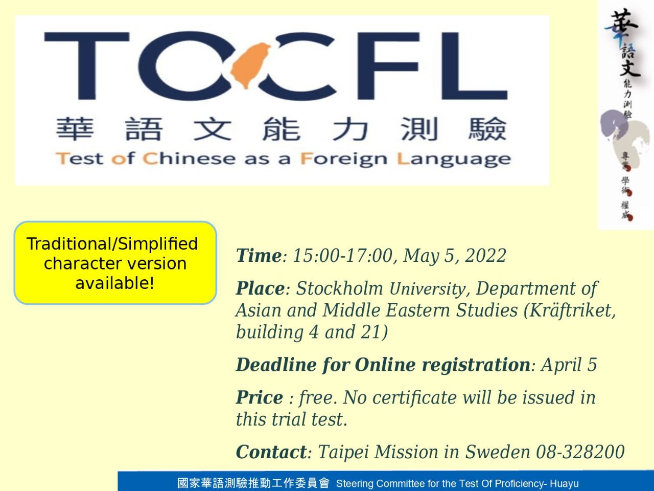 本處將首度與斯德哥爾摩大學亞洲及中東研究系合作辦理華語文能力測驗(TOCFL)免費試測。歡迎18歲以上,母語非中文人士報考。 試測不提供證書,但受試者可上網查詢成績,做為未來報考正式測驗的暖身 。完成測驗的考生將可獲得精美文件夾及華語文獎學金資料乙份。