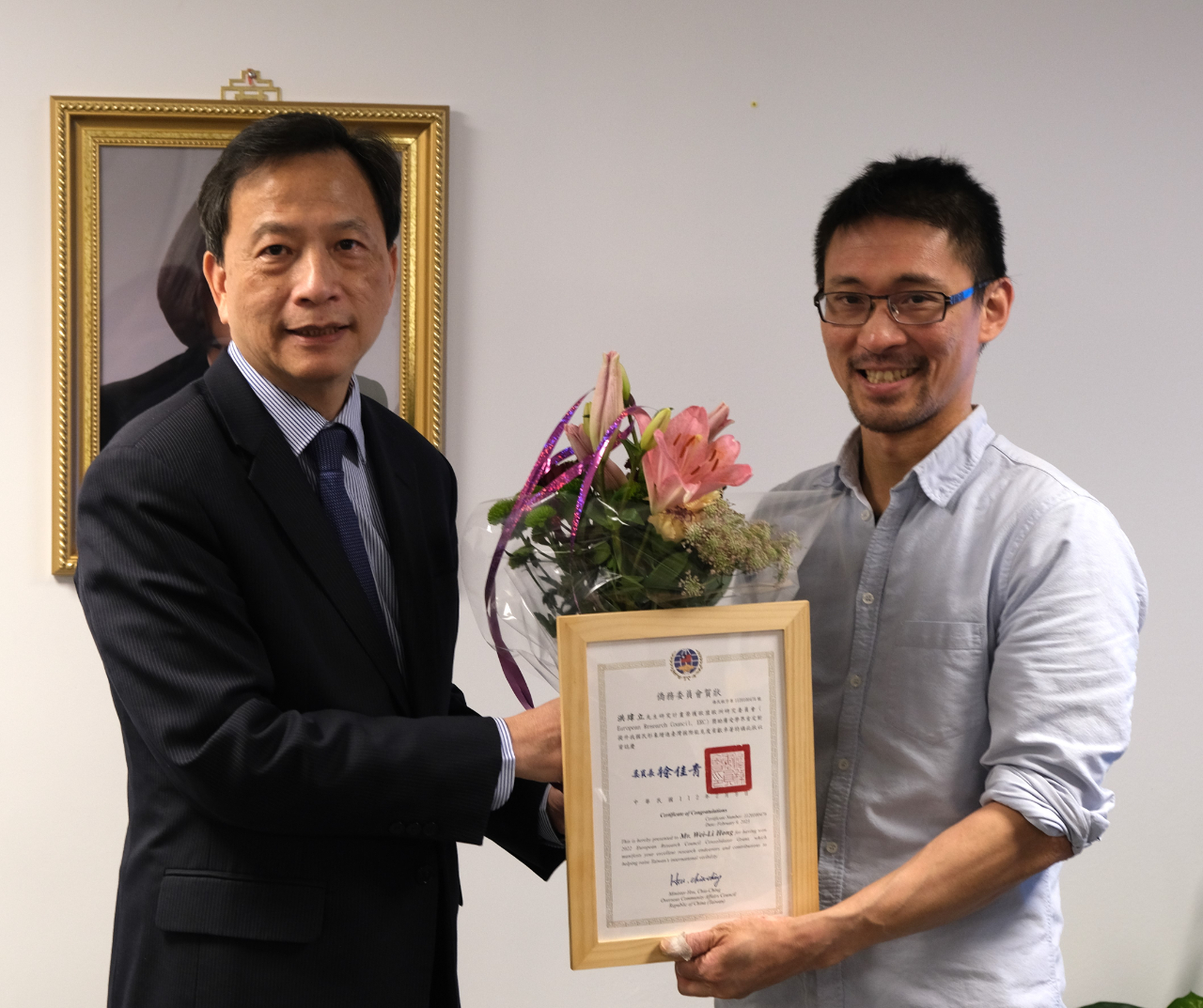 我駐瑞典代表處谷大使瑞生本年3月17日在駐處主持旅瑞臺灣學人洪瑋立教授榮獲歐盟科研委員會2022年整合獎助金(European Research Council (ERC) Consolidator Grants)慶祝活動,並代表行政院僑務委員會徐委員長佳青頒發賀狀,同時向與會斯德哥爾摩大學國際處及地質系所代表之瑞典學術界強調,臺瑞合作及人才交流將帶動效益極大化之雙贏局面。