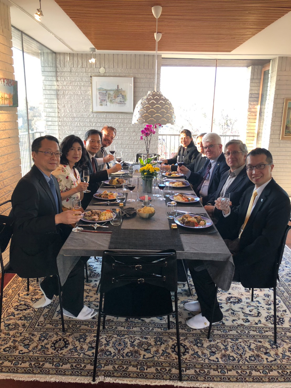 我駐瑞典谷瑞生大使夫婦邀請瑞典皇家理工學院第一暨國際關係副校長Prof.Stefan Östlund、國際長Prof. Urban Westergren、化學系系主任Prof. István Furó、工業工程管理學院能源科技系邱甯瑋教授及副校長機要何穎方小姐等餐敘