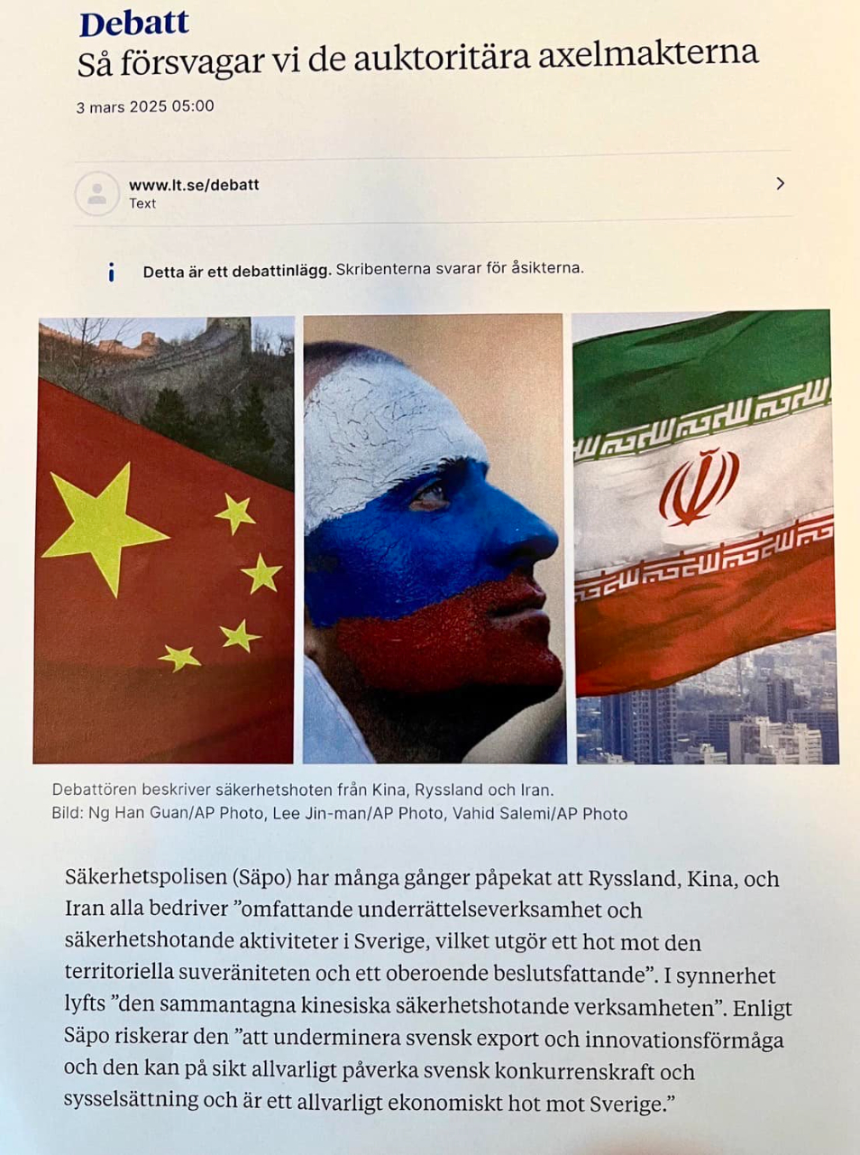 中俄威權聯手,不只台灣有事,美歐都會有事,呼籲理念相近國家增加軍事能力,減少對俄羅斯、中國的能源和財政依賴及支持以規則為基礎的國際秩序。瑞典國安局(SÄPO)多次指出,俄羅斯、中國及伊朗均在「瑞典進行廣泛的情報蒐集及安全威脅活動,對領土主權及獨立決策構成威脅」,尤強調「中國整體的安全威脅活動」。