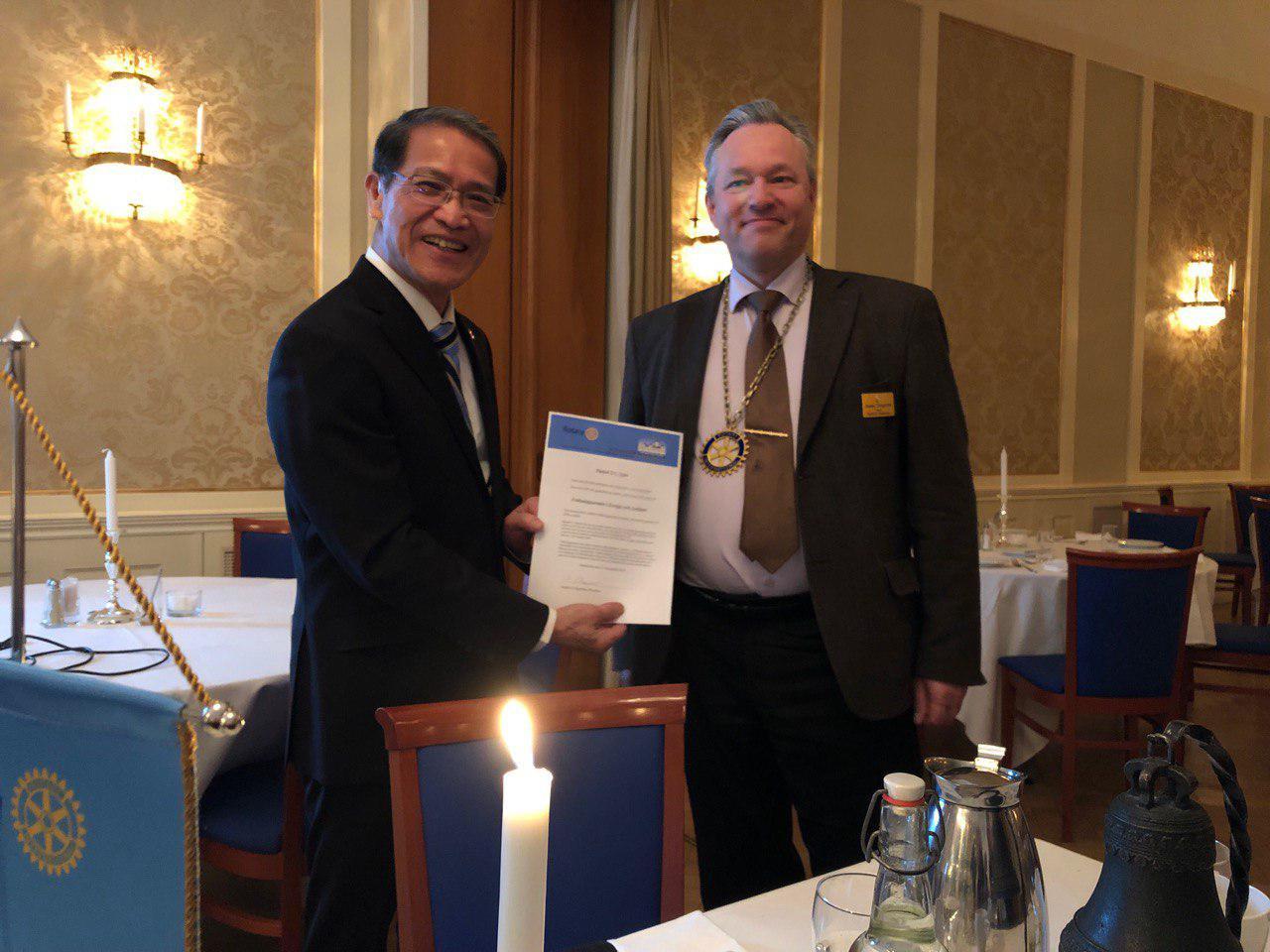 活動尾聲Stockholm-Vasaborgen扶輪社社長Anders Chrigström除感謝廖大使透過本次精彩演講讓社員了解臺灣外,亦頒贈扶輪社榮譽社員狀予廖大使。
