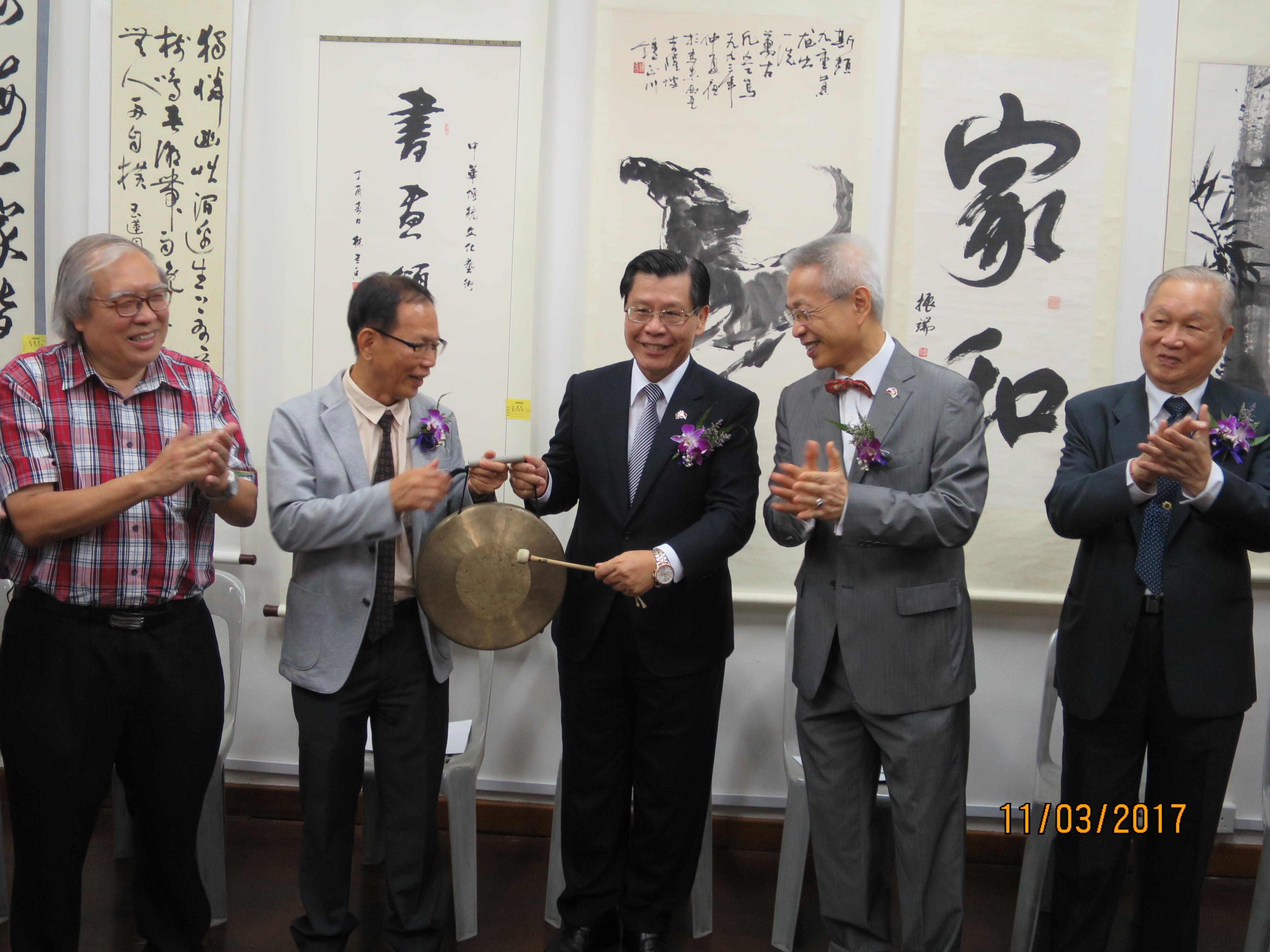 「同德書畫展」開幕典禮於本(3)月11日下午舉行,一連4天展出33位包括同德社員及其他來自各地的書畫家作品,由梁大使主持開鑼儀式。其他重要貴賓包括僑務委員陳正吉、僑務顧問張嘉升、新加坡美術總會會長梁振康、新加坡留台大專校友會前會長黃渭楠、書法家呂博士振端及本書畫展主編南博士治國等,現場共70餘人。