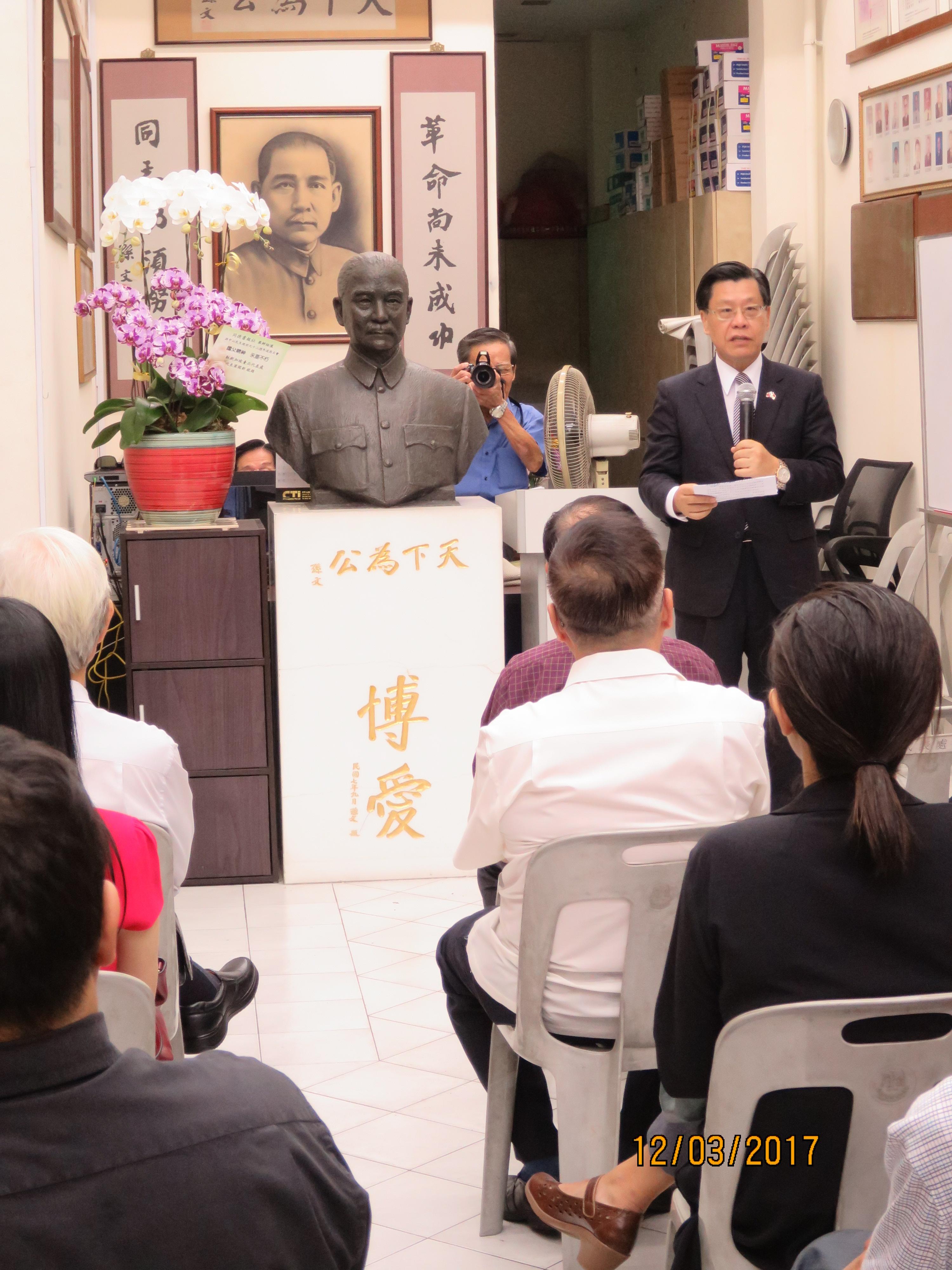 梁大使致詞表示,新加坡同德書報社由孫中山先生於1910年創辦,當時社員受到中山先生愛國理念的感召,追隨國民革命,成功推翻滿清並建立亞洲第一個民主共和國;而同德社員接續在北伐及抗日戰爭期間勇敢無畏的犧牲事蹟與愛國精神,令人動容。時至今日,中山先生一心為國、不謀私利之典範,更值得我們後代學習。