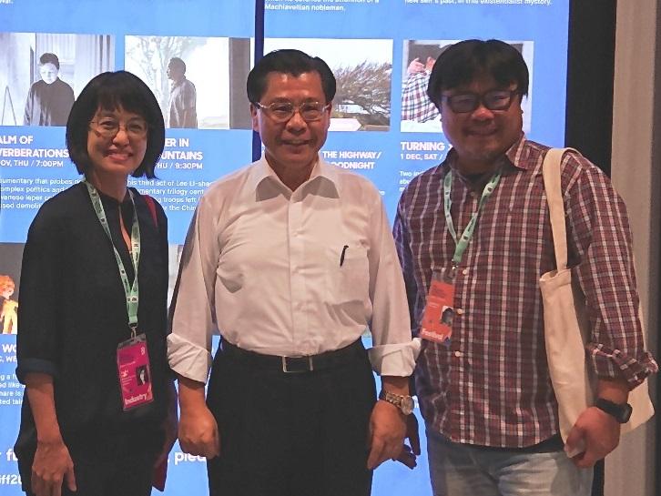 駐新加坡台北代表處梁國新代表(中)於11月30日出席觀賞紀錄片「在高速公路上游泳」,與導演吳耀東(右)、「財團法人國家電影中心」副執行長陳德齡合影。