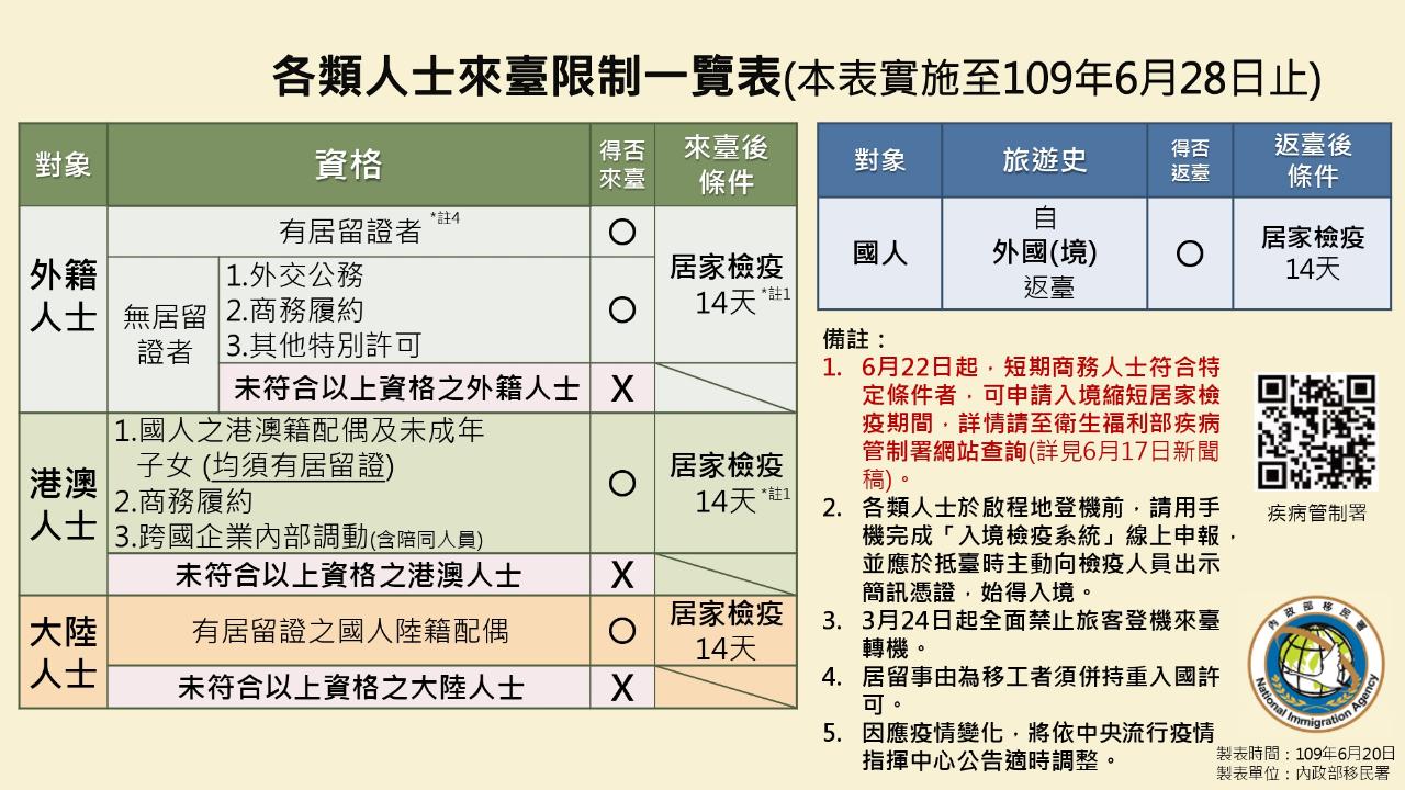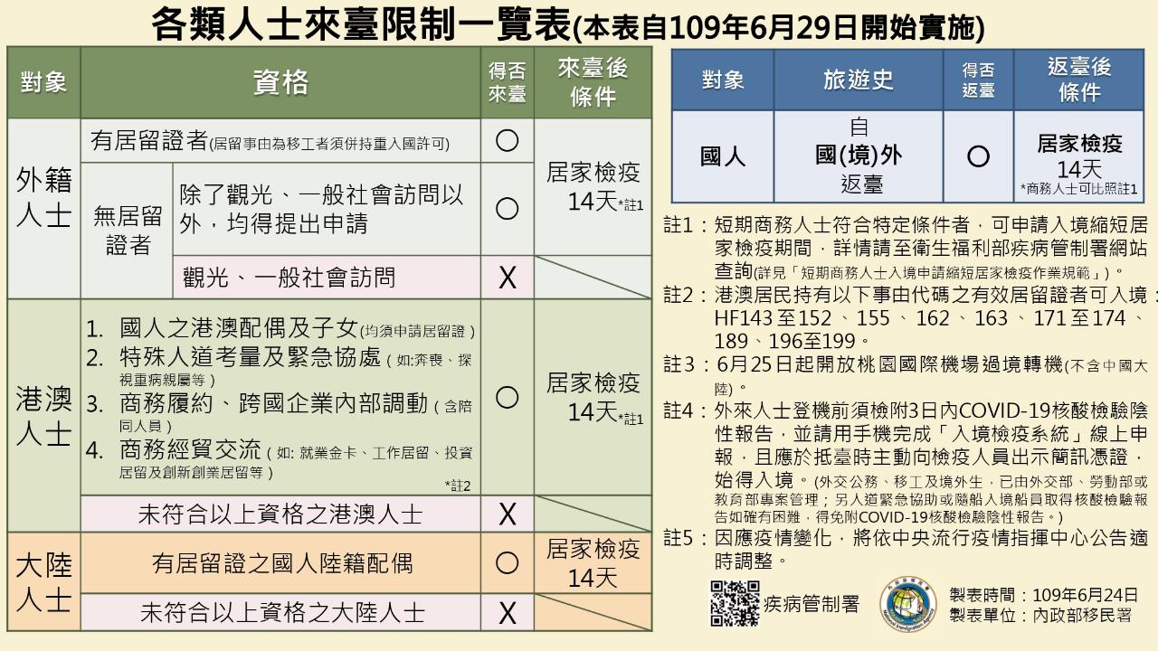 各類人士來臺限制一覽表(自109年6月29日開始實施)