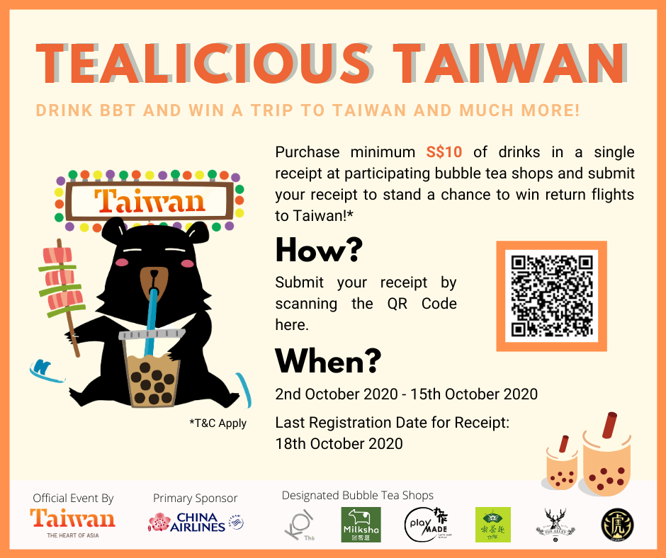 台灣觀光局新加坡辦事處考量新加坡民眾對於台灣珍珠奶茶的熱愛以及因為疫情期間無法前往台灣旅遊的遺憾,特地與中華航空聯合舉辦「Tealicious Taiwan」活動。結合了六家新加坡知名的台灣珍奶店一起共襄盛舉,吸引當地民眾藉著品嘗珍珠奶茶同時有機會贏得飛台灣的來回機票。