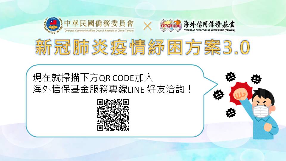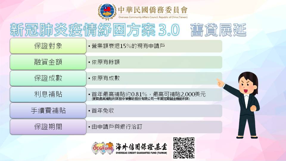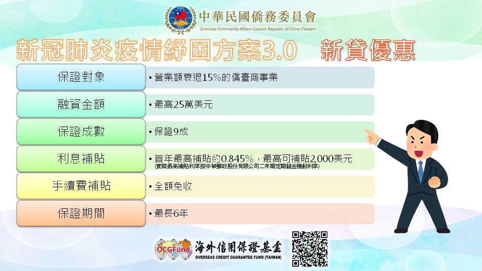 鑒於海外新冠肺炎疫情仍嚴峻,海外僑臺商紓困需求日增,財團法人海外信用保證基金推出COVID-19紓困3.0方案,新貸案件之貸款金額由原10萬美元提高至25萬美元,保證成數由原8.5成提高為9成,另原有送保貸款案件無法依約還款者,可申請舊貸展延,為疫情受災僑臺商提供最實際之協助,俾協助僑臺商度過難關。