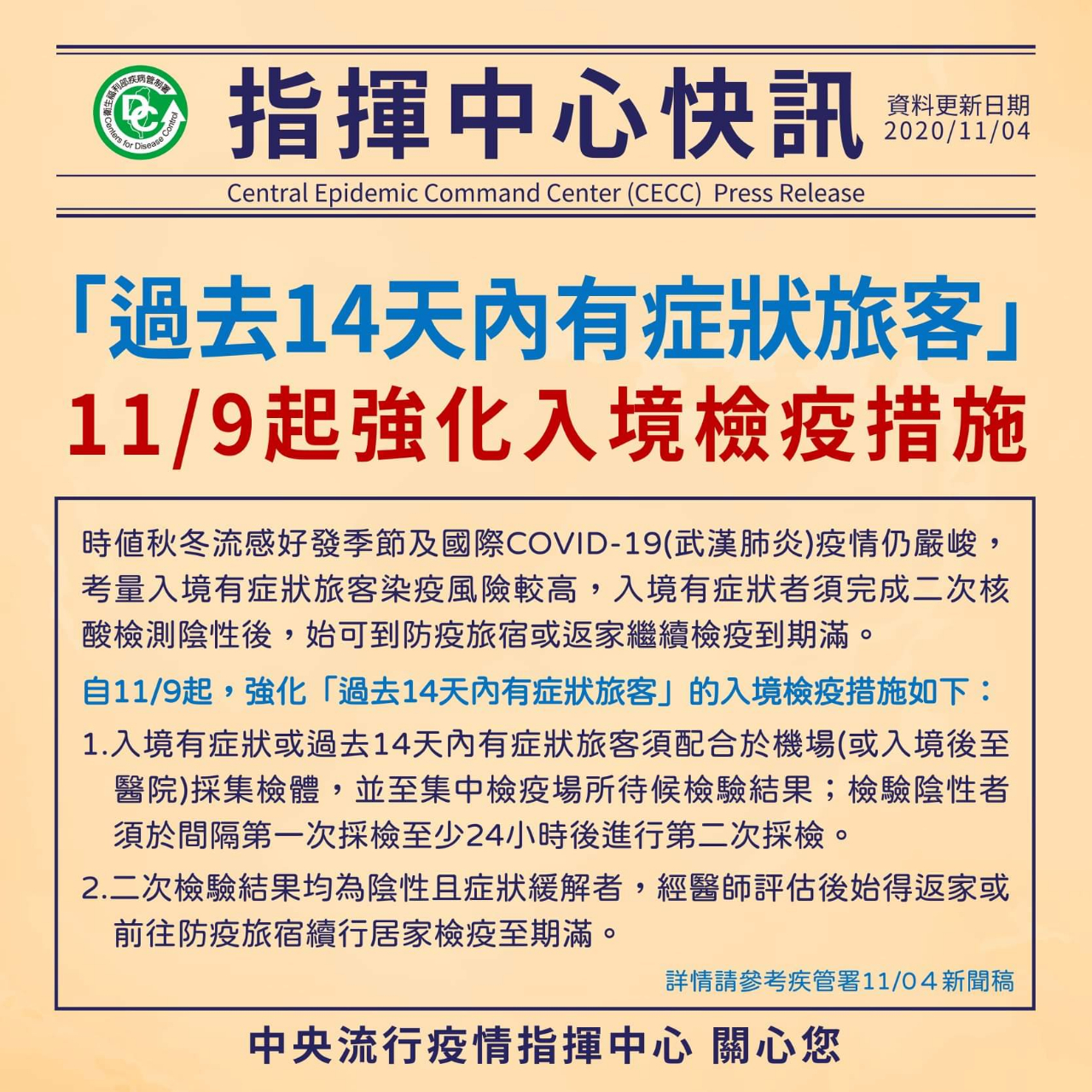 指揮中心指出,自本(2020)年11月9日起,強化「過去14天內有症狀旅客」的入境檢疫措施如下: