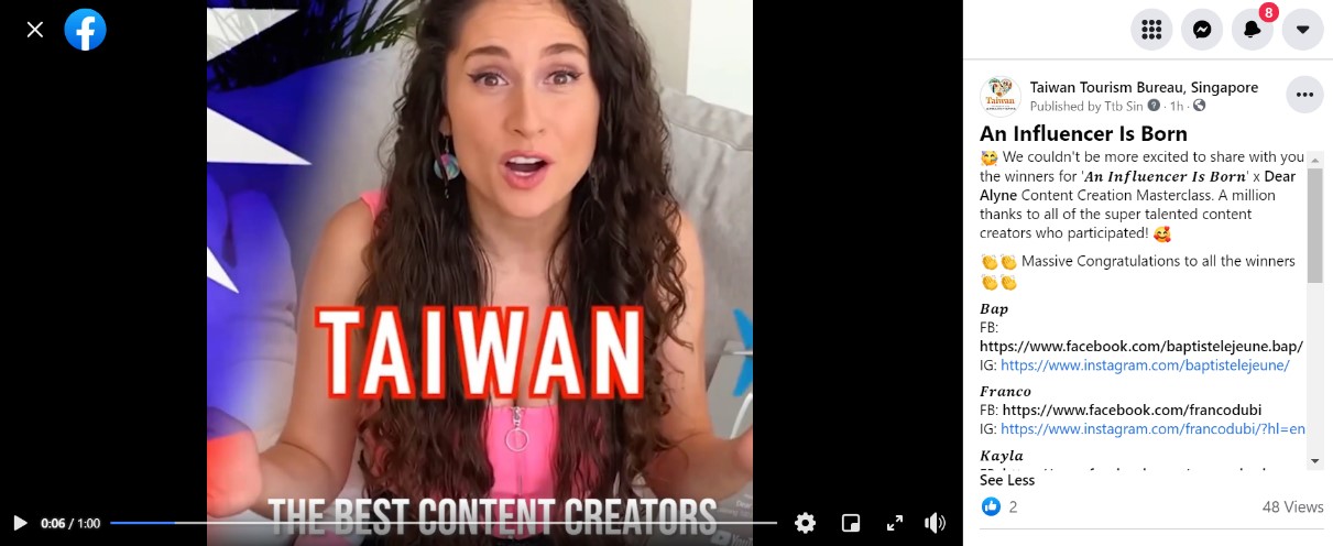 為了加速運用網路無遠弗屆功能,提供許多目前無法來到台灣觀光的外國旅客多樣豐富及最新台灣旅遊資訊,並提前布局New Normal下的國際旅遊宣傳,台灣觀光局新加坡辦事處與知名網紅Dear Alyne合作辦理「一個網紅的誕生An Influencer is Born」微網紅招募活動,歷經8周大師授課及製作台灣觀光宣傳影片作業的緊湊時間,終於在最後21強入選者、網紅養成線上課程、影片製作後,由Dear Alyne及台灣觀光局新加坡辦事處團隊選拔出本次活動的6名優勝者,將於國境解封后前往台灣實地體驗Taiwan-The Heart of Asia的精髓所在。