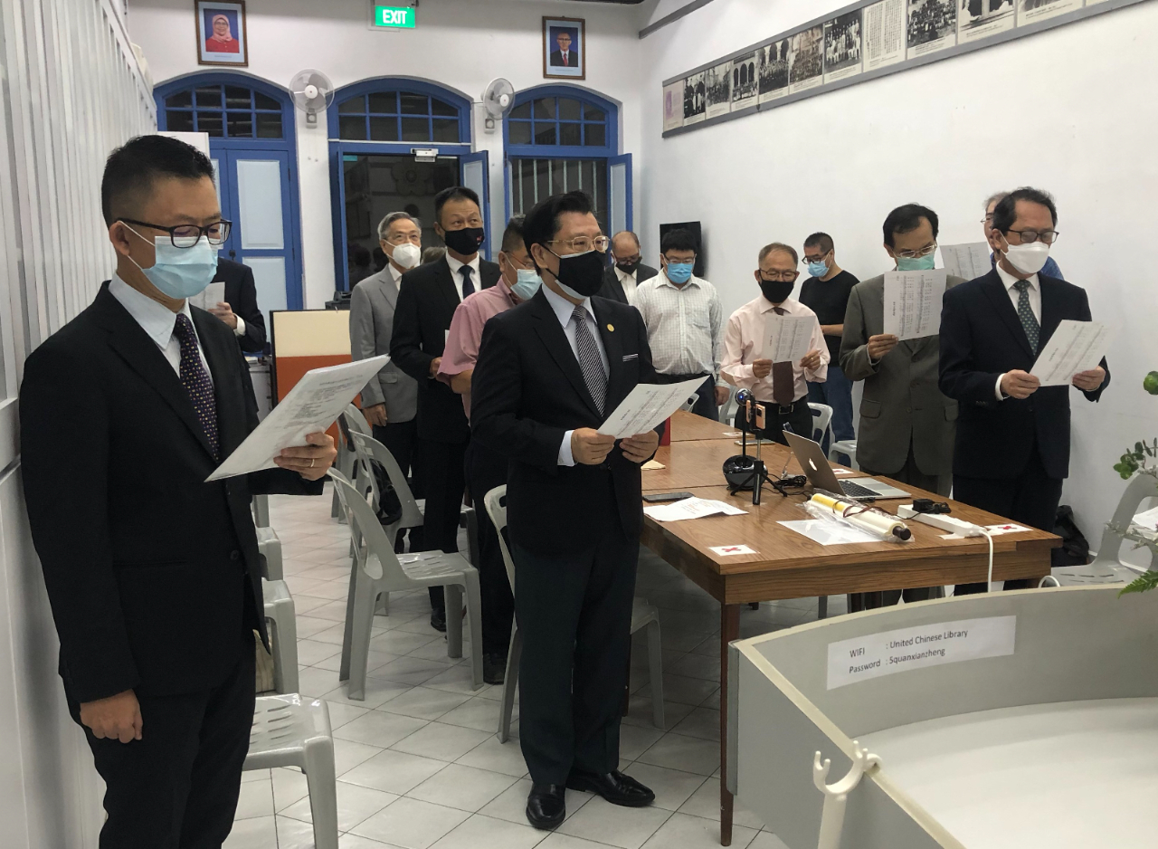 本年因防疫規定限制,同德書報社以在該社「中山紀念堂」舉辦現場活動,結合線上參與方式辦理小型紀念會。紀念會首先由梁代表向國父銅像獻花,接著全體行禮致敬並合唱總理紀念歌,簡單隆重。
