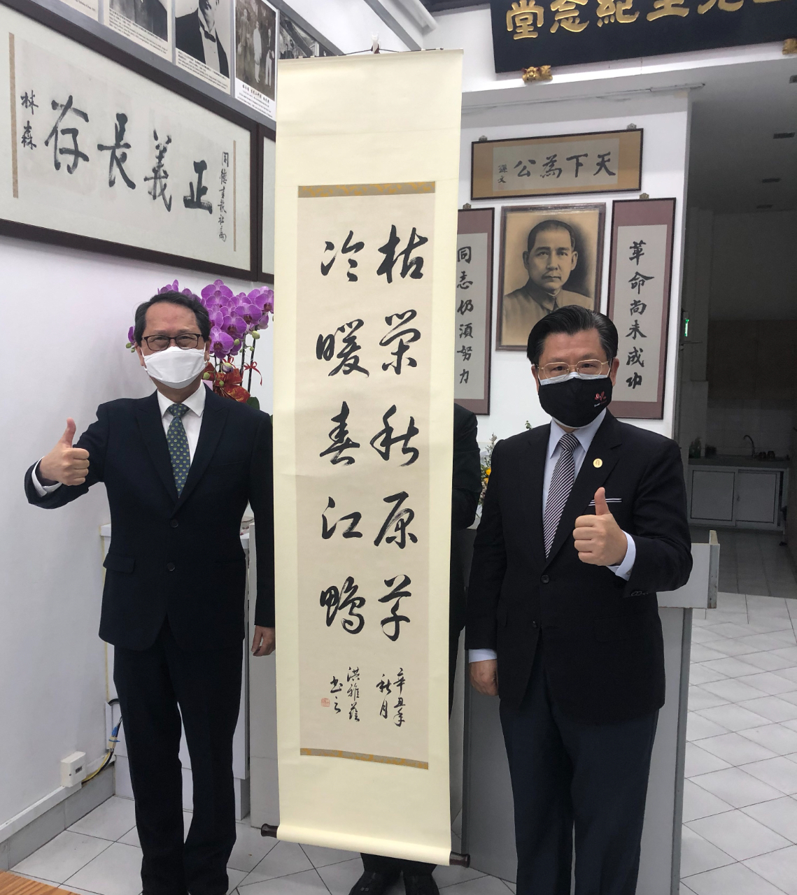 羅社長接著致贈資深社友洪雅蔭所書墨寶「枯榮秋原草,冷暖春江鴨」予梁代表,並說明分別來自白居易及蘇東坡詩句,意謂看開枯榮,認識冷暖,方能看開世界,識得人情;梁代表表示感謝並期許社員秉承創辦人孫中山先生的創社宗旨與精神,堅定支持自由民主及中華民國。