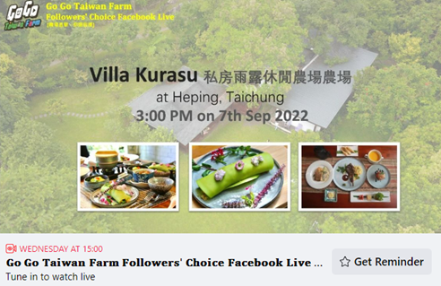 台灣的休閒農場結合了農業生產及體驗生態,加上實現了「From Farm to Table」的低碳健康美食,向來是本地人愛好闔家出遊、全家放鬆的旅遊模式之一。台灣觀光局駐新加坡辦事處與台灣休閒農業發展協會、本地大通旅遊共同合作推出「農場直擊,你選我播」Part I活動,第一波票選出之第2家「私房雨露休閒農場」,將於9月7日下午3點由本地專業電台主持人林安娜小姐帶領大家透過台灣觀光局駐新加坡辦事處的臉書社群線上連線、鏡頭直擊體驗「私房雨露休閒農場」的好玩及好吃~