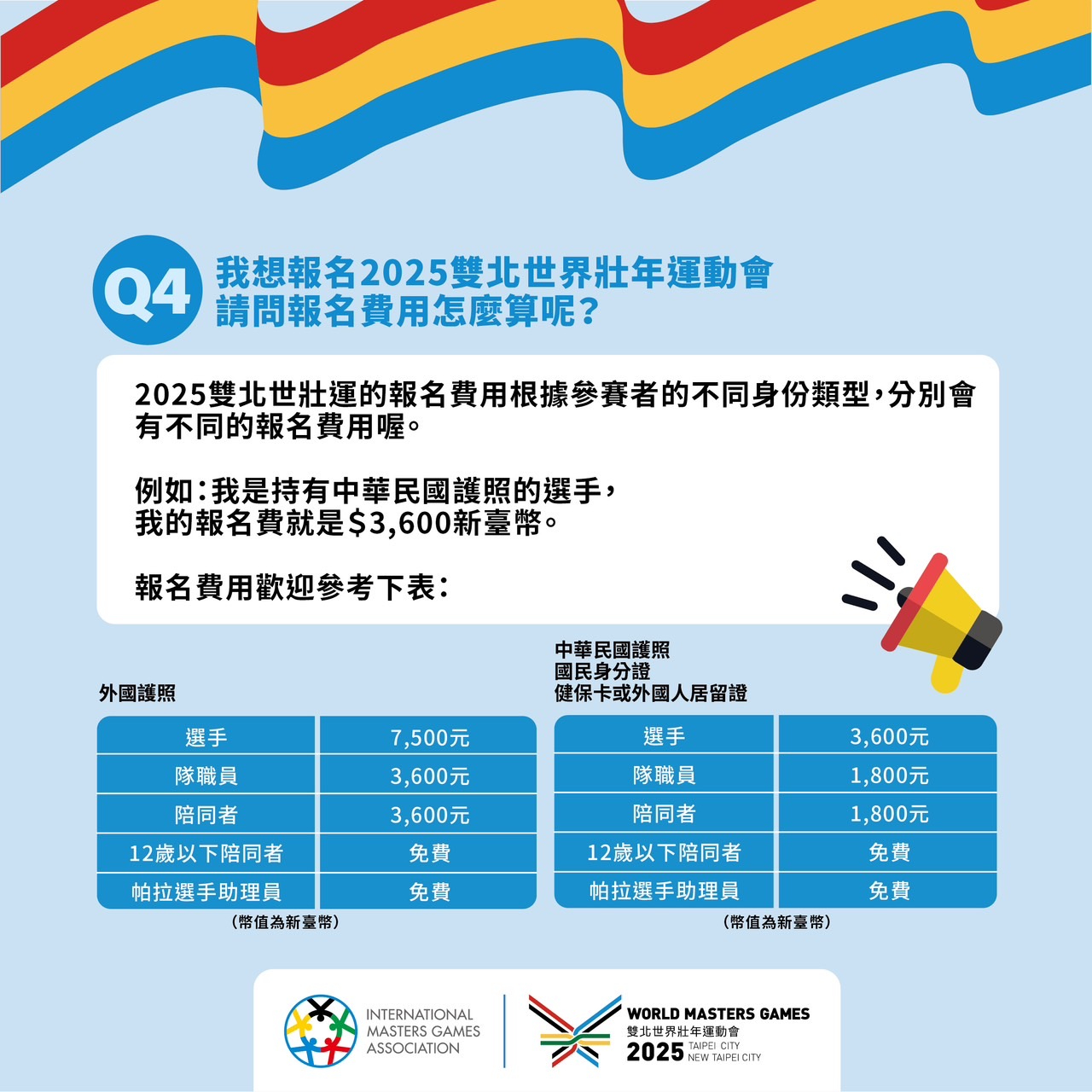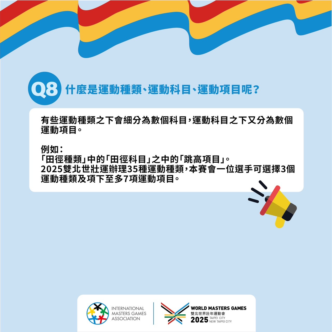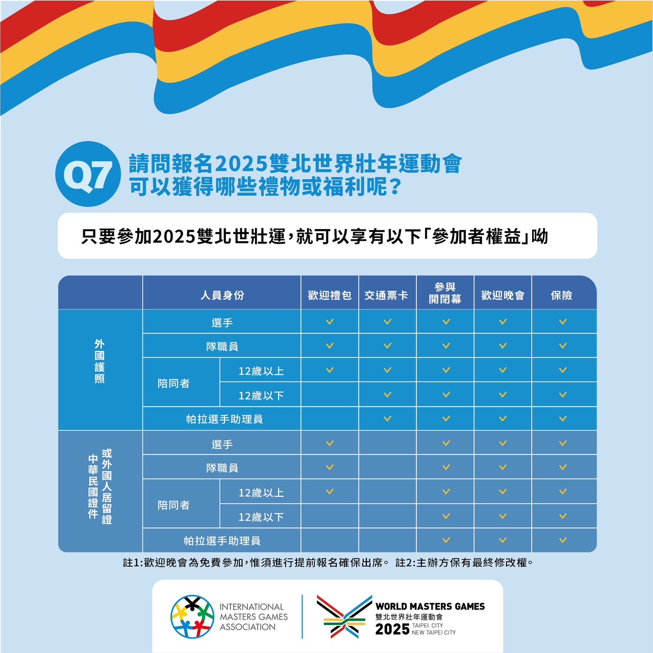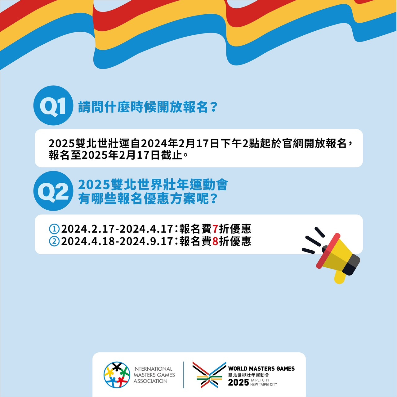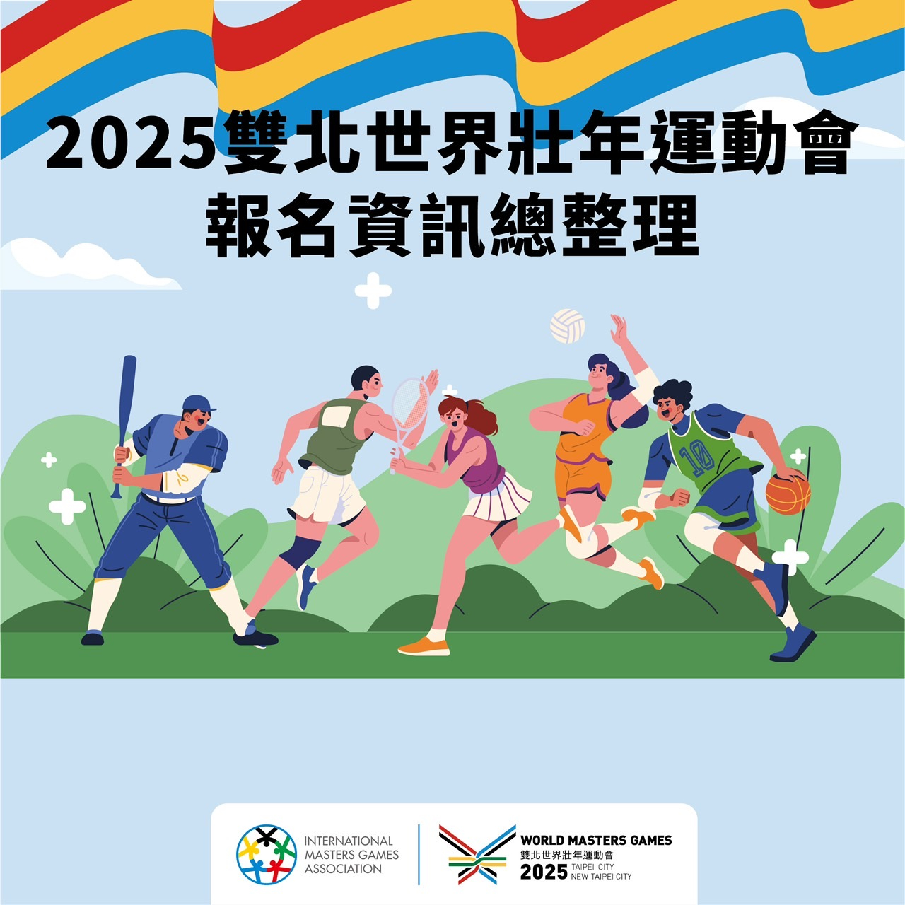 2025雙北世界壯年運動會於2024年2月17日下午2點於世壯運官網開放報名,共有35種運動種類、283項運動項目(含性別、分級及年齡組共計11,688小項)只要年滿30歲以上(實際報名年齡請依技術手冊為主),年齡無上限,無需經過選拔,皆採個人報名,本賽會結合運動與觀光旅遊的國際綜合型賽會,以運動切磋交友、以觀光文化認識臺灣,請大家踴躍報名。