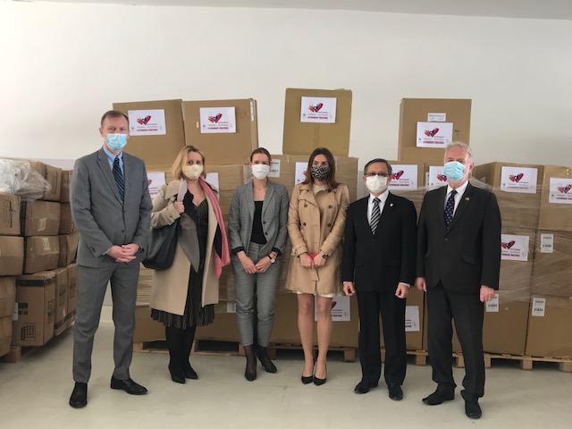 臺灣捐贈斯洛伐克的20萬枚口罩於4月20運抵斯洛伐克國家物資儲備管理局,由駐斯洛伐克代表處曾大使瑞利代表轉致,斯國外交部高層官員、國家物資儲備管理局總協調人Natalia Petrikova、物資局倉儲中心主任Tibor Zachar等政府官員共同接收我方捐贈,斯國國會友台小組主席Peter Osusky特地趕赴現場見證觀禮。