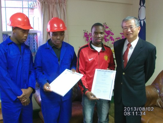 蔡大使捐出三千史幣成立登記合法的公司,三位畢業生拿著成立公司Ma-Chazi Limited公司登記證及營業執照呈給蔡大使一閱