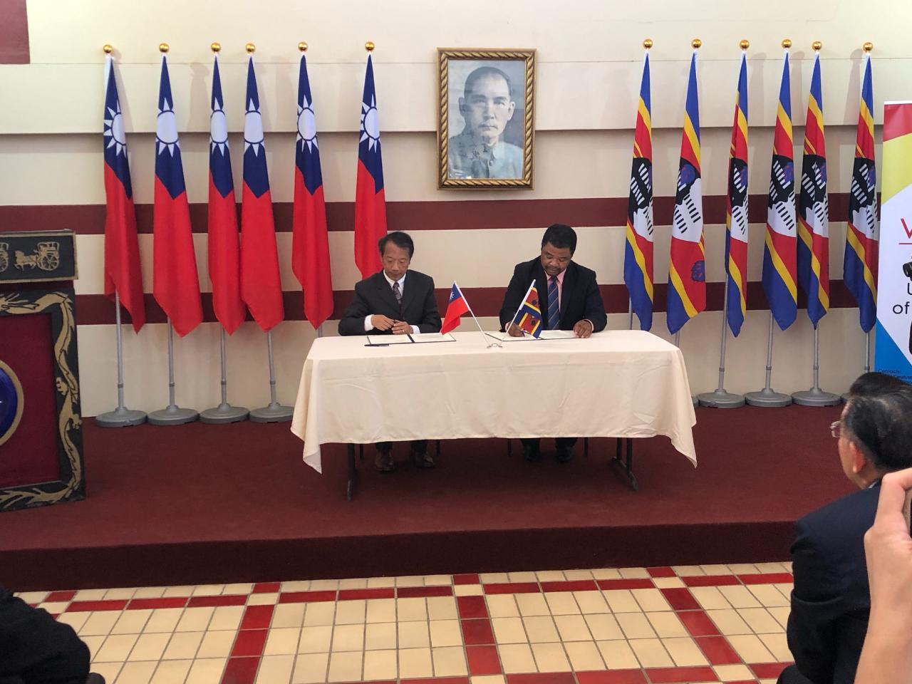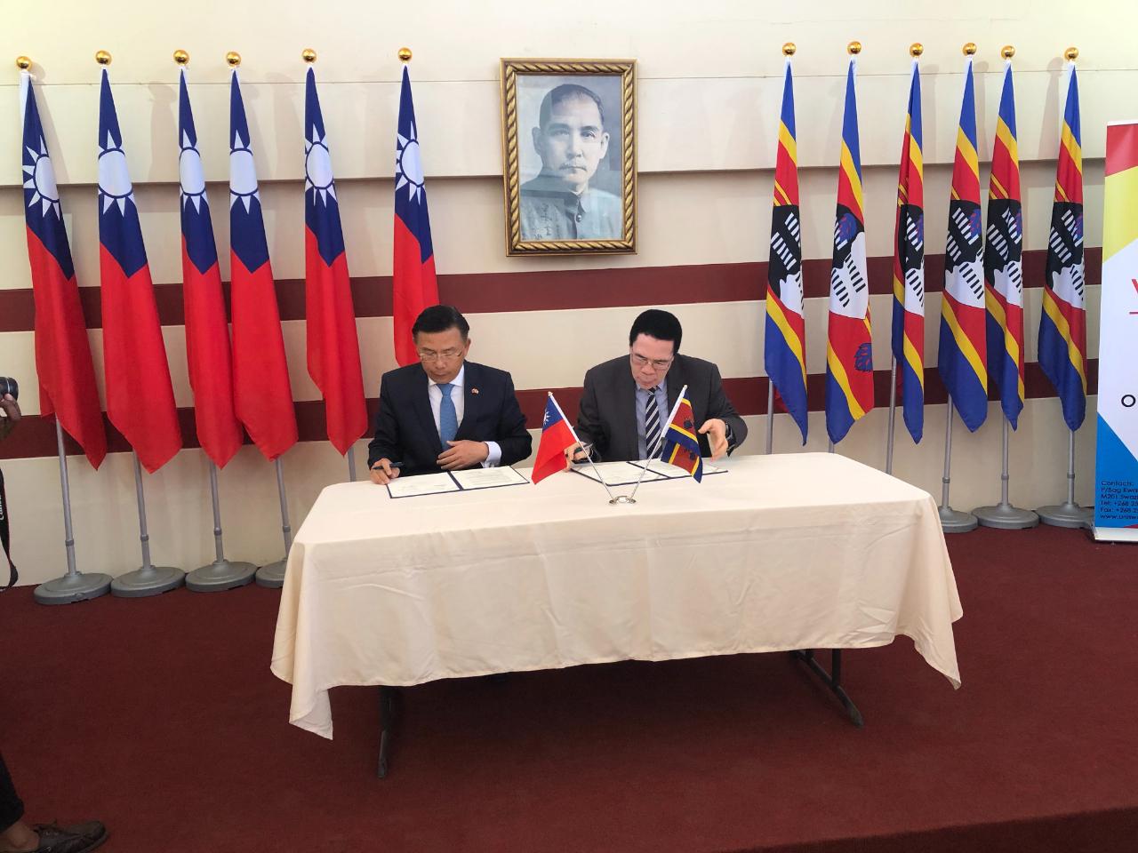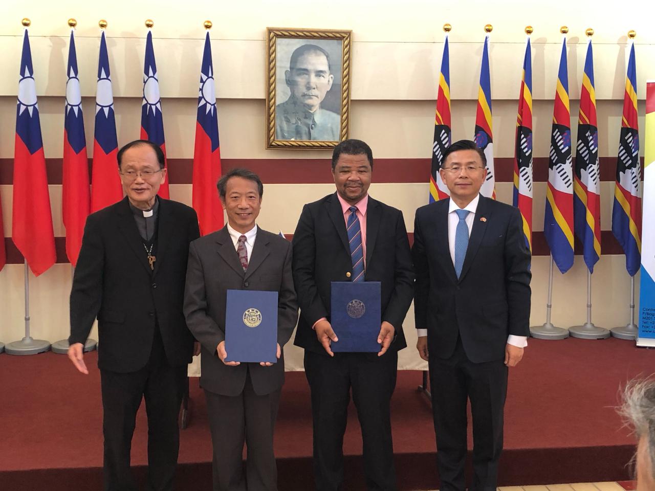梁大使主持並見證靜宜大學唐傳義校長與史瓦帝尼大學副校長Justice Thwala在本館簽署合作備忘錄。該備忘錄將有助雙邊就生物科技、紫杉醇發展及靈芝等項目合作,加深臺史合作及為史國創造就業機會!