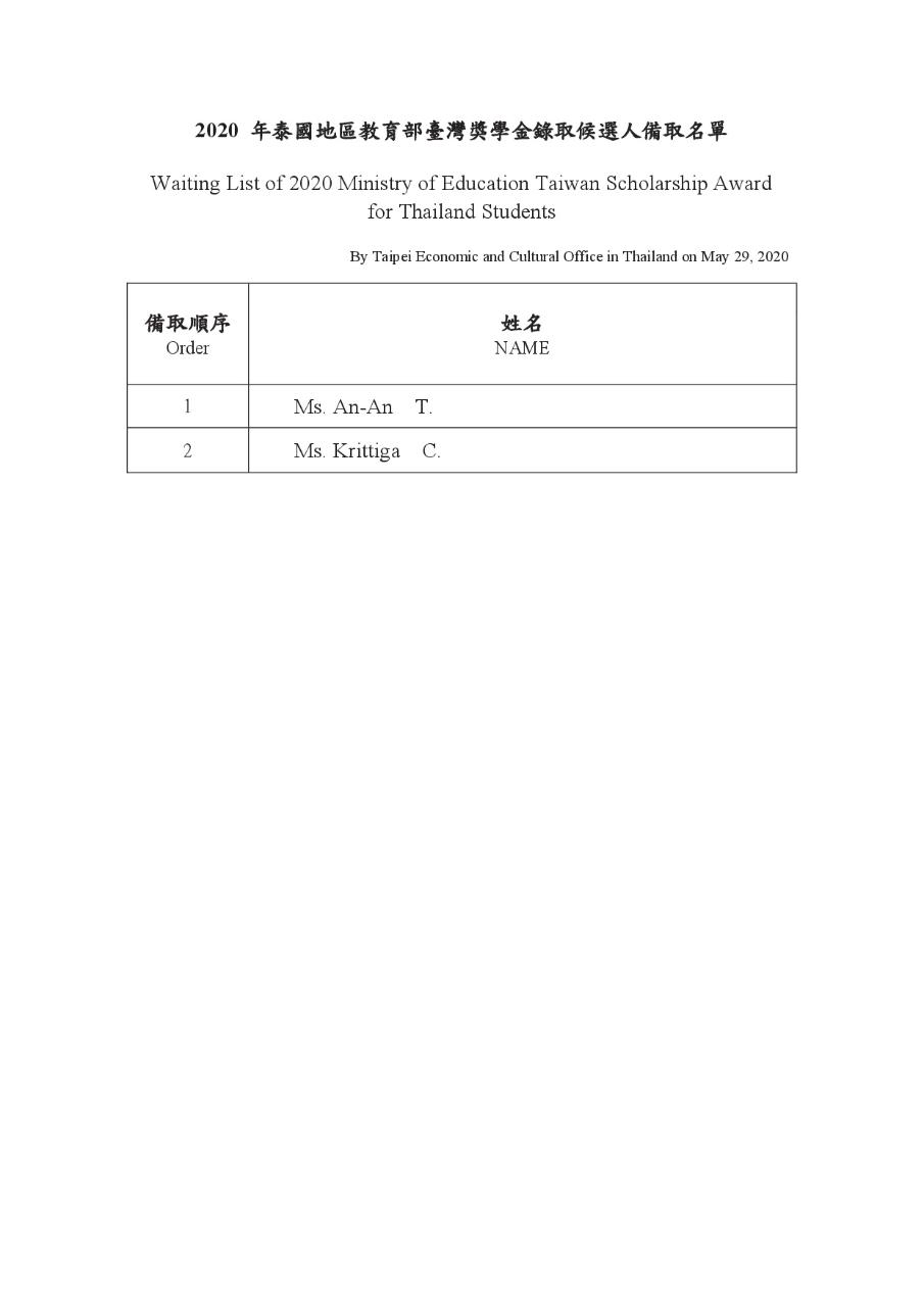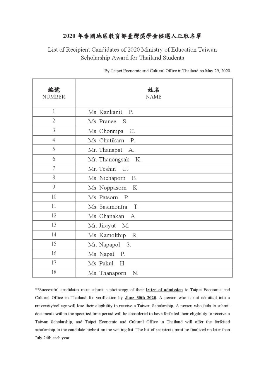 【公告】2020年泰國地區臺灣獎學金正、備取名單 - 駐泰國台北經濟文化辦事處 Taipei Economic and Cultural Office in Thailand ::: 跳到主要內容區塊