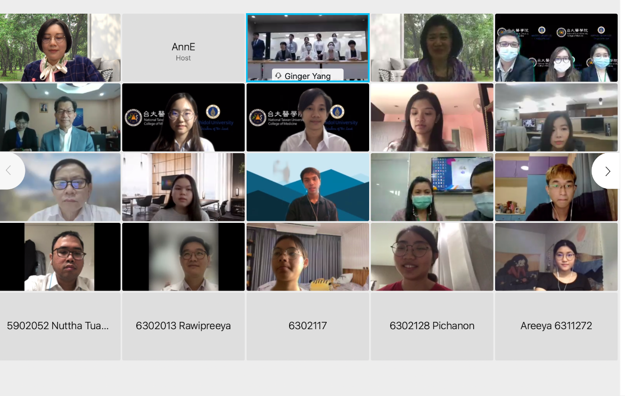 泰國瑪希敦大學(Mahidol University)拉瑪醫學院與臺灣大學醫學院於本(2021)年2月23日共同舉辦雙邊醫學生視訊座談,分享疫期期間經歷的衝擊及學習與生活的調適。